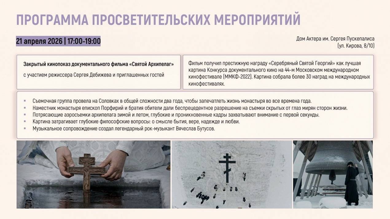Туда сложно добраться, а посетить может лишь 60 тысяч человек в год. Правила установили ученые, поскольку Соловецкий архипелаг - объект Всемирного наследия ЮНЕСКО с хрупкой экосистемой. Экспонаты — фотографии от Михаила Скрипкина, теперь в Ярославле. Руководитель издательского отдела Спасо-Преображенского Соловецкого ставропигиального мужского монастыря 40 лет делал снимки природы и православных святынь. Ярославцы уже успели оценить выставку.