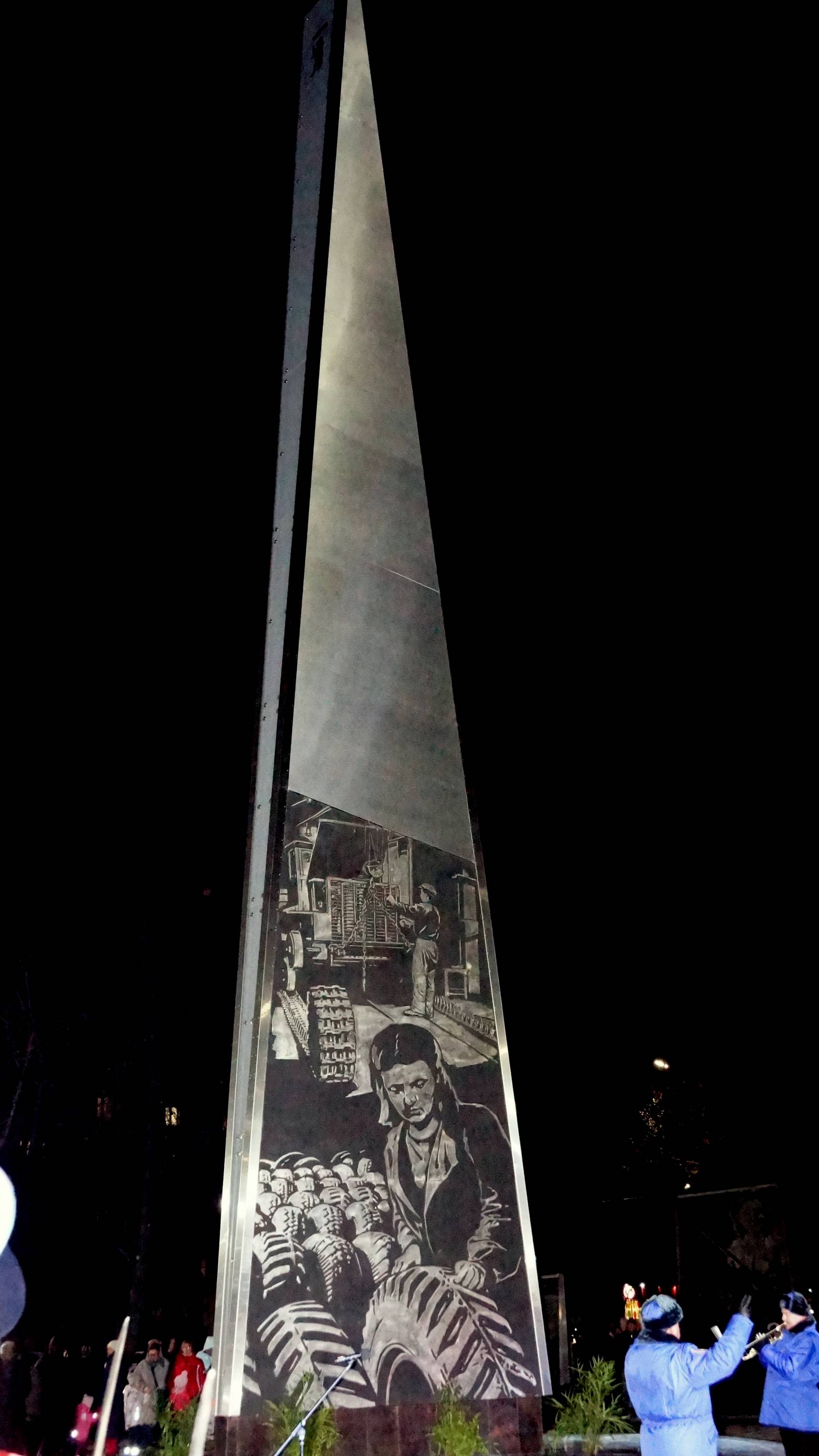 Высота стелы — 17 метров. Автор монумента — скульптор Денис Стритович, победивший в конкурсе, объявленном мэрией города. Конструкция выполнена из чёрного металла с холодным цинкованием в несколько слоев. На самой стеле и четырёх пилонах размещены исторические фотографии, отражающие труд жителей Ярославля в годы войны.