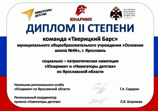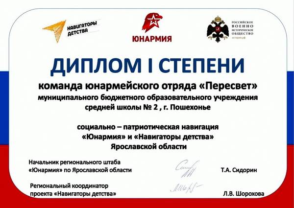 13 мая 2024 года подведены итоги патриотической навигации «Юнармия» и «Навигаторы детства» - территория патриотизма» (далее – «Навигация»). Акция проведена в период с 01 апреля по 08 мая 2024 года в рамках всероссийского проекта «Верни Герою имя», реализуемого Всероссийским военно-патриотическим детско-юношеским общественным движением «Юнармия». Партнёром данного мероприятия на территории Ярославской области выступило региональное отделение Российского военно-исторического общества.