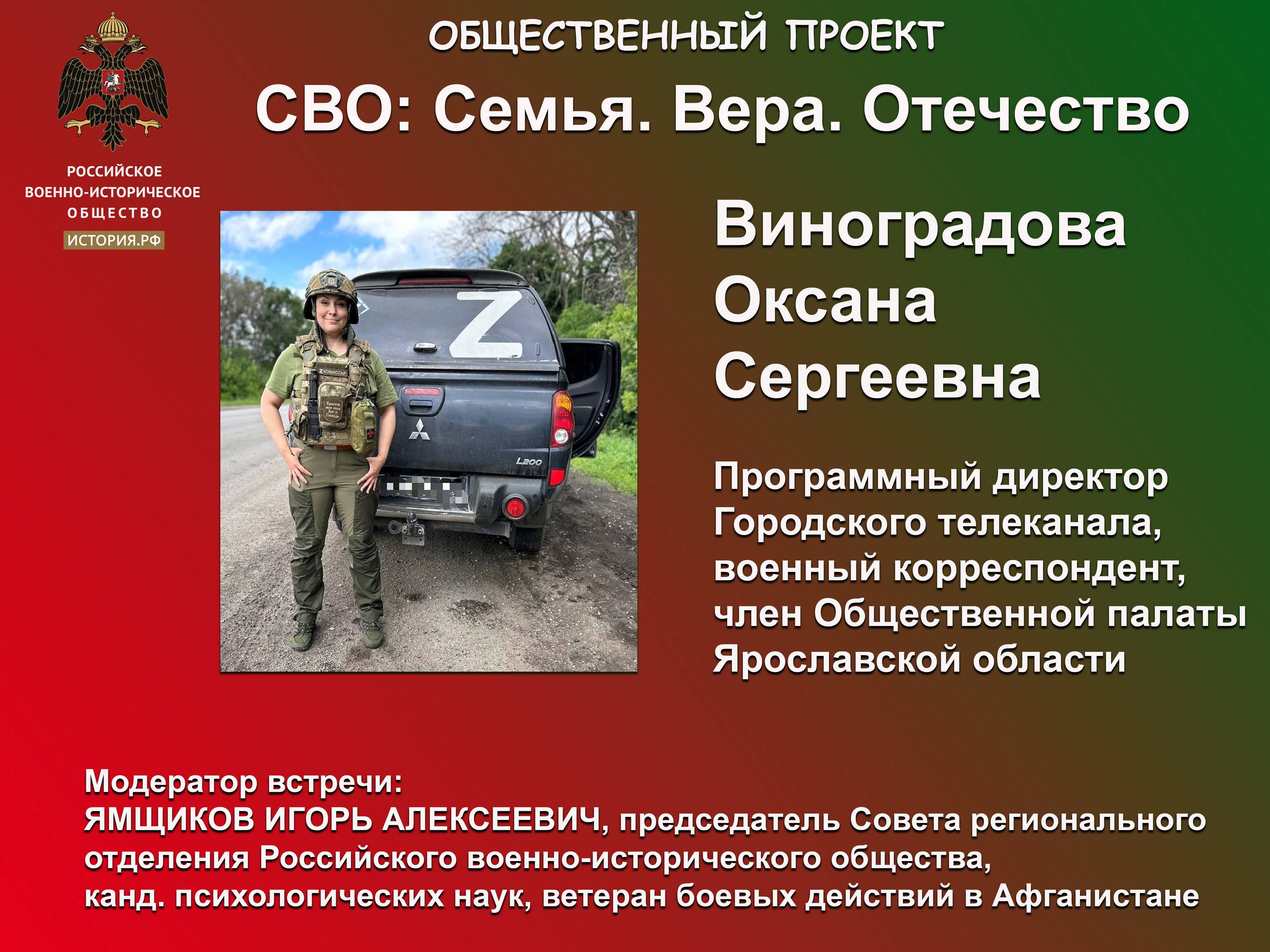 Организаторами стали ЯРО РВИО и Областная Некрасовская библиотека. Председатель Совета ЯРО РВИО Игорь Ямщиков поделился в соцсетях впечатлениями о встрече: "Встреча с программным директором Городского телеканала, военкором Оксаной Виноградовой никого не оставила равнодушной. Разговор был не столько про войну. Это был честный и искренний разговор, ответы на вопрос - почему наши парни геройски шаг за шагом приближают победу, в чём находят силы? И ещё о том, почему мы все должны помогать тем, кто сейчас на переднем крае, каждый на своём месте. Почётным гостем встречи стал ветеран СВО, участник губернаторской программы "ГЕРОИ ЯРОСЛАВИИ" Артём Гаина. Его слова благодарности в адрес Оксаны за то, что она и её коллеги-военкоры делают сегодня в зоне СВО, стали запоминающимся финалом встречи".