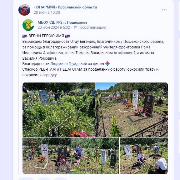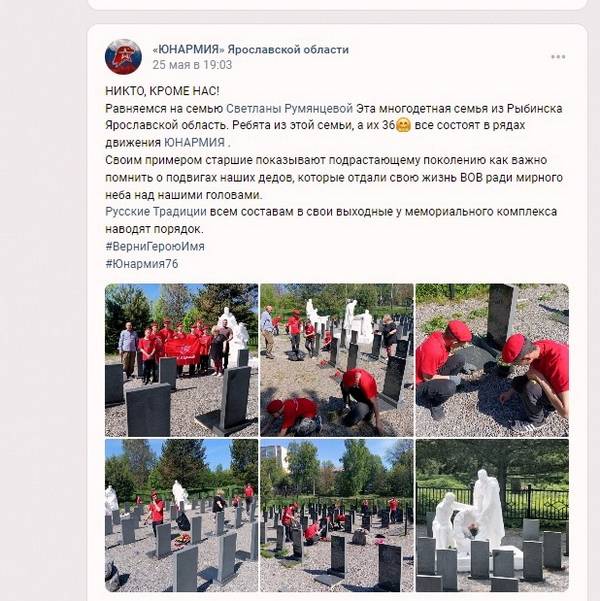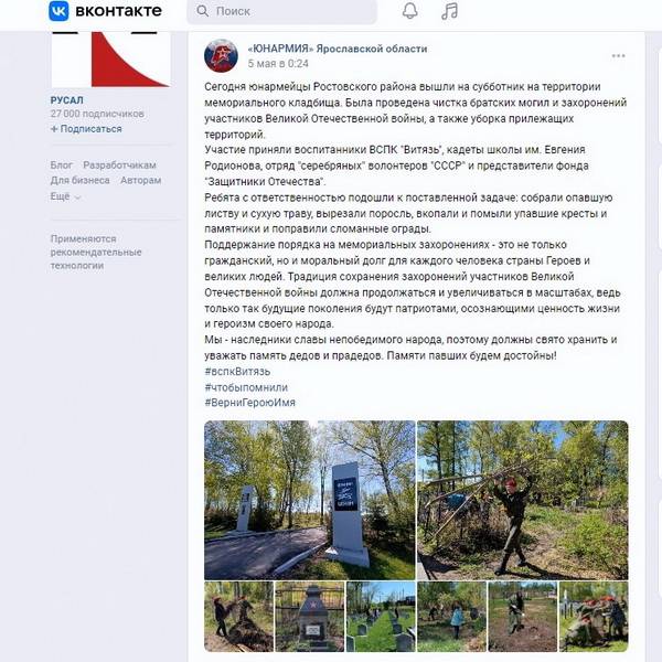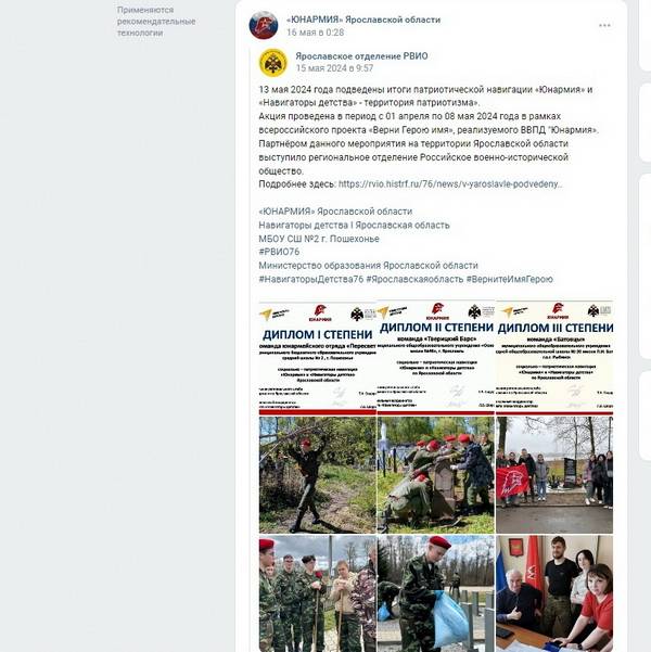 "Эта настоящая командная победа. – прокомментировал руководитель регионального штаба «ЮНАРМИИ» Ярославской области Тарас Сидорин. - Региональное отделение РВИО стало также партнёром ЮНАРМИИ Ярославского региона и в проекте социально-патриотической навигации «ЮНАРМИЯ» и «Навигаторы детства» – территория патриотизма». Наши партнёрские отношения с ЯРО РВИО выражаются не только в словах, но и на деле. Я лично, наши ребята вместе с активом ЯРО РВИО не раз были на воинских захоронениях с целью геолокации объектов, замера координат. Мы вместе благоустраивали братские могилы, например в д. Григорцево Ярославского района, куда можно проехать только на технике большой проходимости. Юнармейские отряды в 2023 году становились победителями акции ЯРО РВИО "Живые имена", посвящённой героям Великой Отечественной войны, чьими именами названы улицы в городах и сёлах Ярославской области."