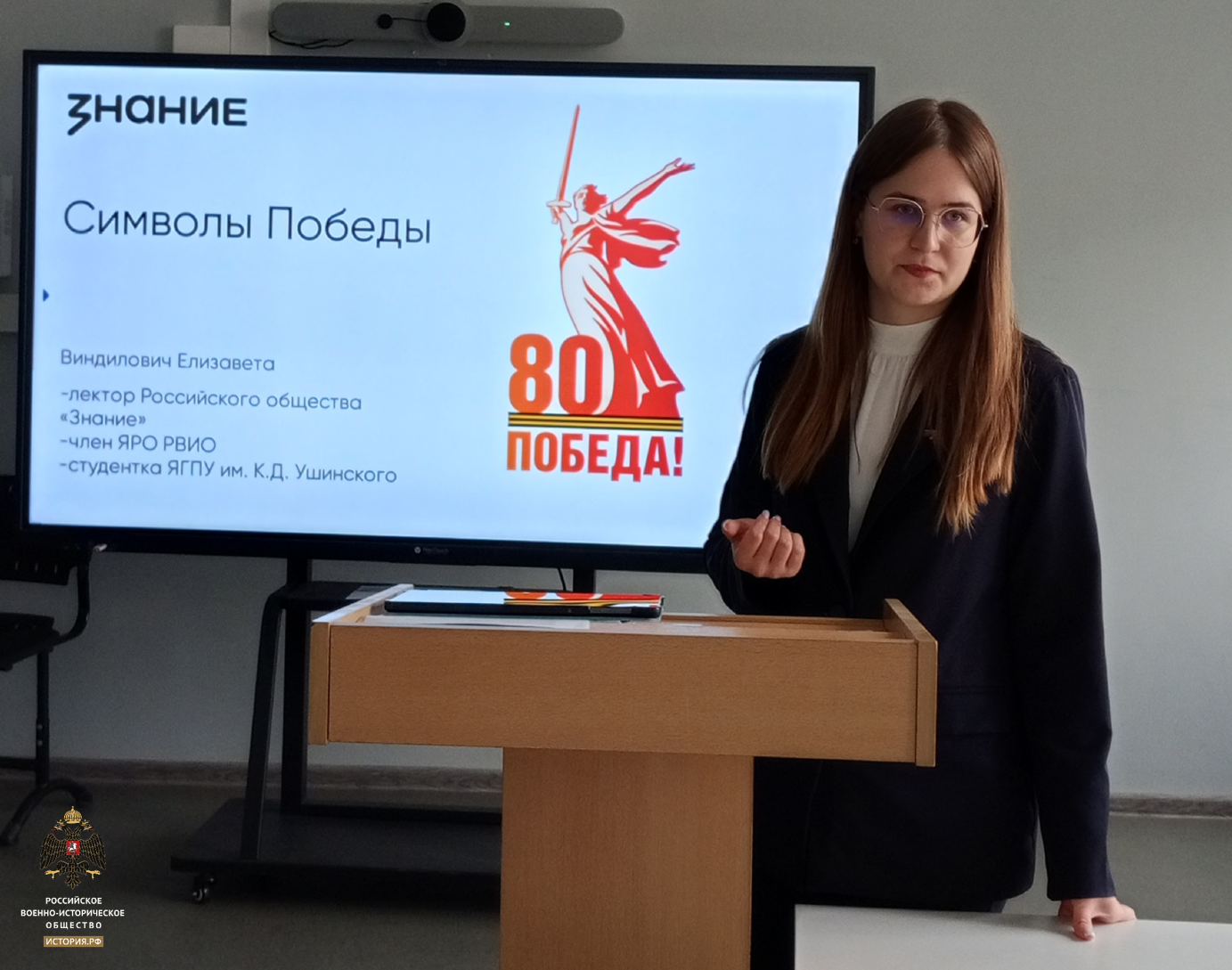В дружеской обстановке член ЯРО РВИО, лектор Российского общества «Знание» Елизавета Виндилович провела увлекательное занятие на тему «Символы Победы» для студентов первого и второго курсов направления «Обществознание и социально-политическая работа».