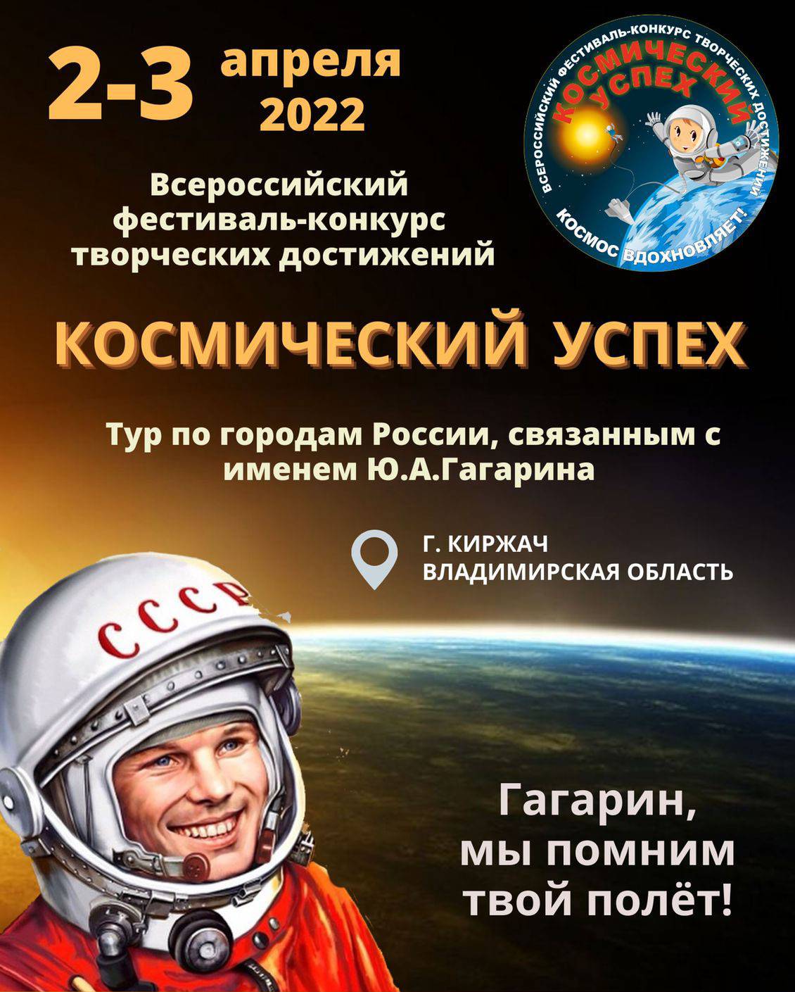 2-3 апреля 2022 г. в рамках фестивального тура по городам России, связанным с именем Ю.А.Гагарина, в городе Киржач Владимирской области прошел очередной этап Всероссийского фестиваля-конкурса творческих достижений "Космический успех" под лозунгом "Гагарин, мы помним твой полёт".