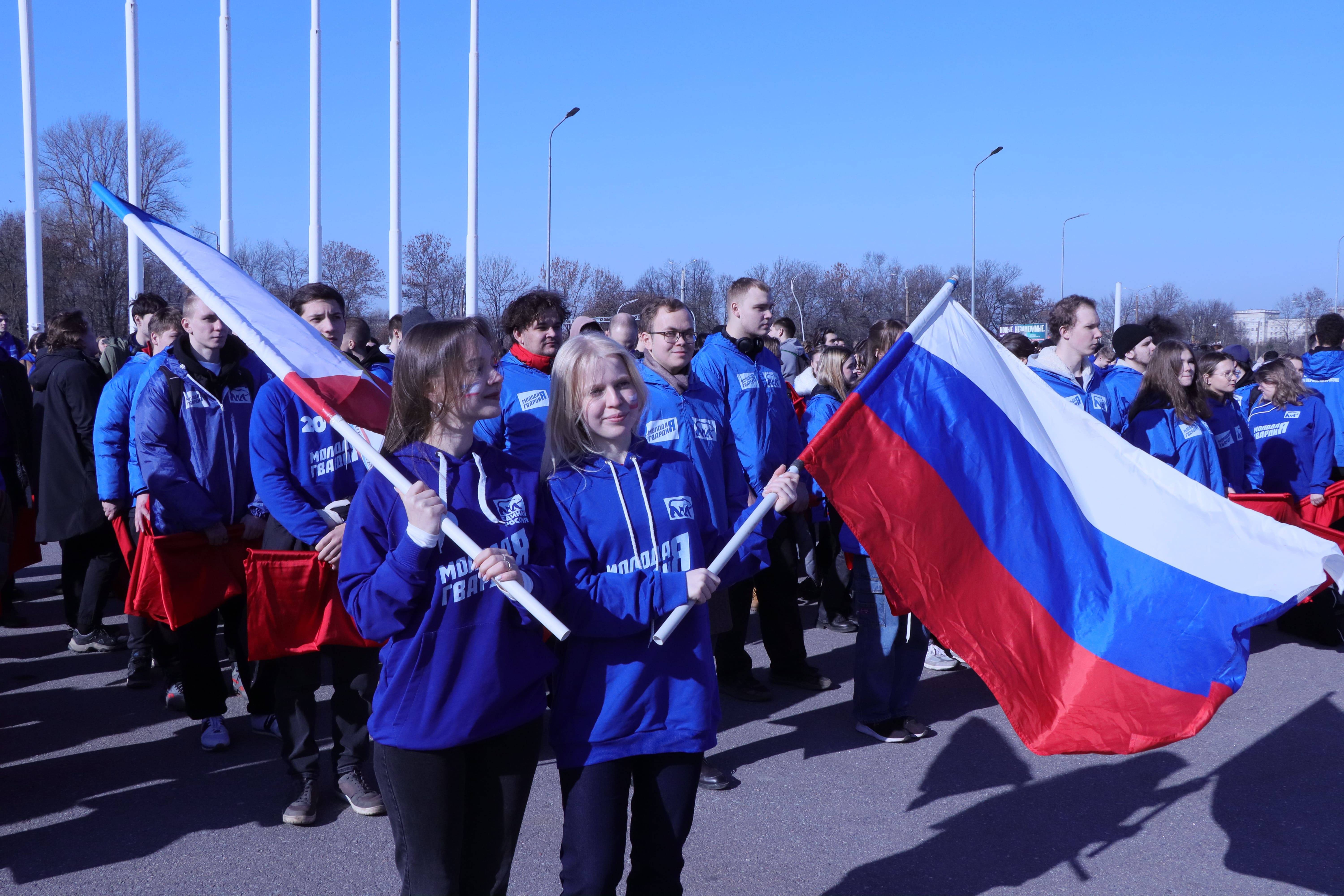 Более тысячи активистов прошли шествием, выстроились в форму флагов России и Крыма, а также слово «ВМЕСТЕ».