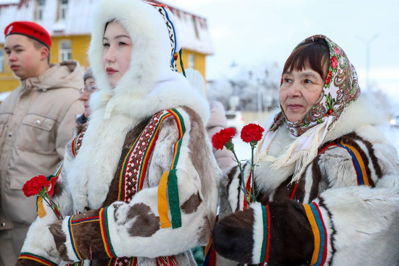 По звуки оленьих колокольчиков - символа дальней дороги, преодоления, памяти, возвращения, активисты РО РВИО в Ненецком автономном округе возложили цветы к памятнику и почтили память отважных земляков минутой молчания.
