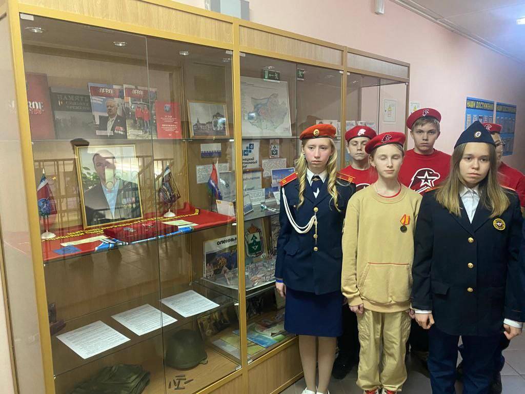 После торжественной церемонии посвящения в юнармейцы на третьем этаже школы был открыт Уголок Героя в память об Александре Буланове.