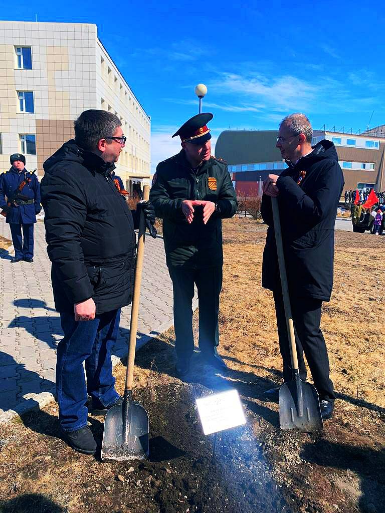 Губернатор Чукотского автономного округа Роман Копин, Глава городского округа Анадырь Леонид Николаев и председатель Совета регионального отделения, офицер Управления Росгвардии по Чукотскому автономному округу майор Павел Шатских заложили на вечное хранение емкость с землей, доставленной на Крайний Север от стен рейхстага и с территории берлинского Трептов-парка.