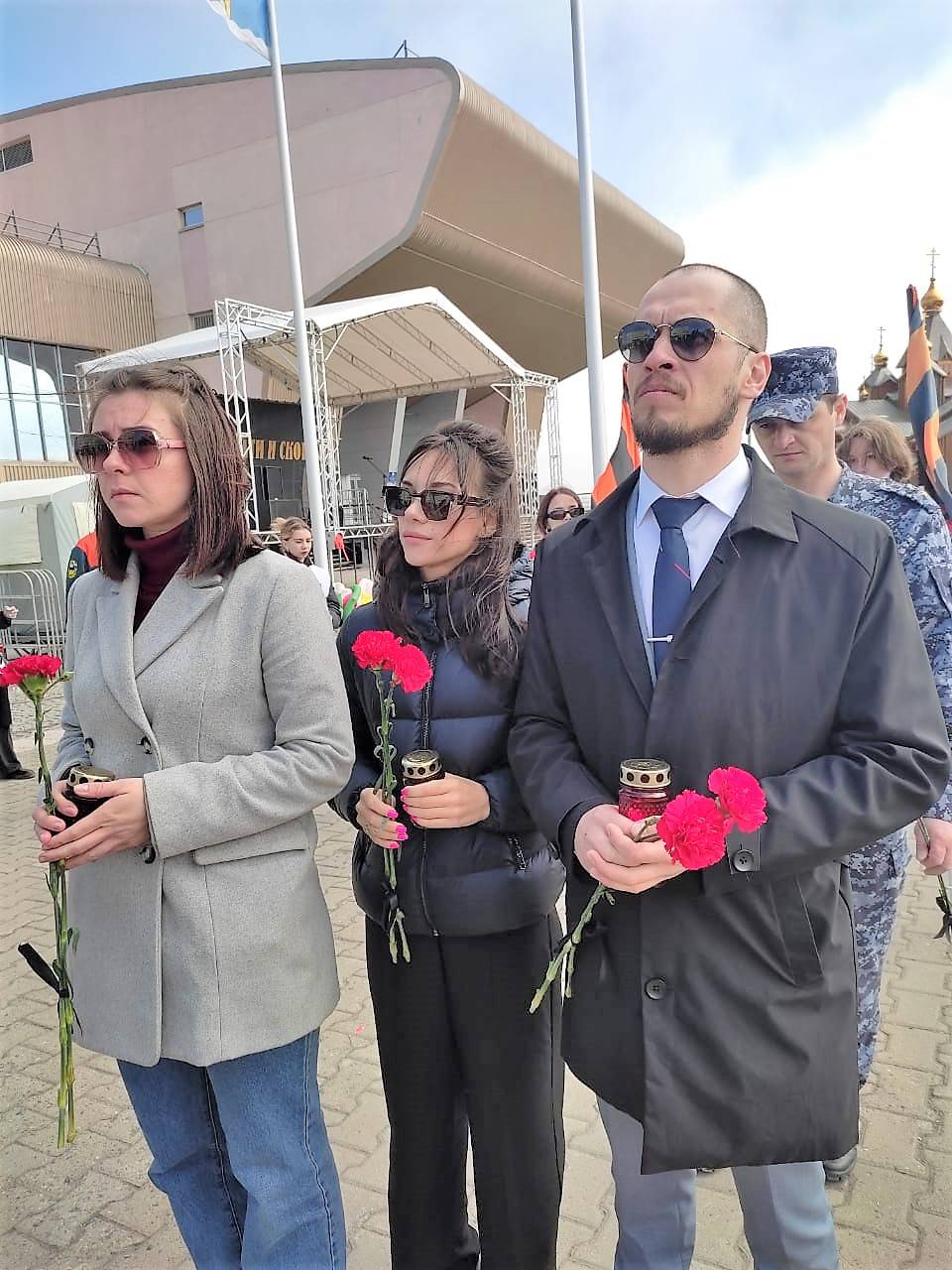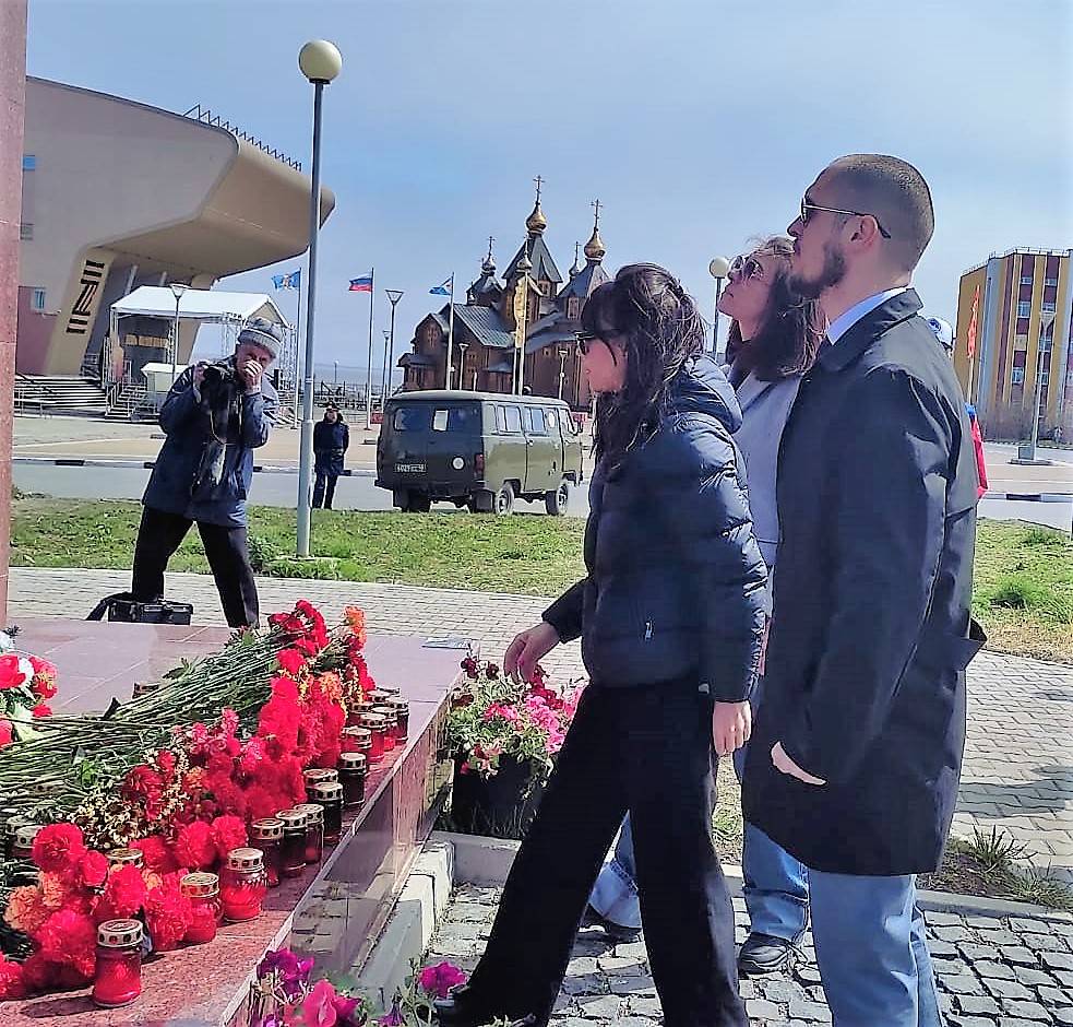 Почтили погибших воинов минутой молчания, зажгли "Свечу Памяти" и возложили цветы к мемориалу "Чукотка - Фронту"