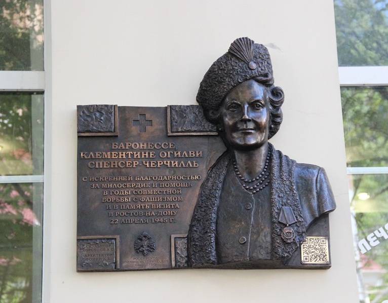 Клементина Спенсер-Черчилль — жена премьер-министра Великобритании Уинстона Черчилля, в годы Второй мировой войны она была президентом «Фонда Красного Креста помощи России» (действовал с 1941 по 1946 год). В апреле 1945 года она посетила Ростов-на-Дону и остановилась в здании, где позже была установлена доска.