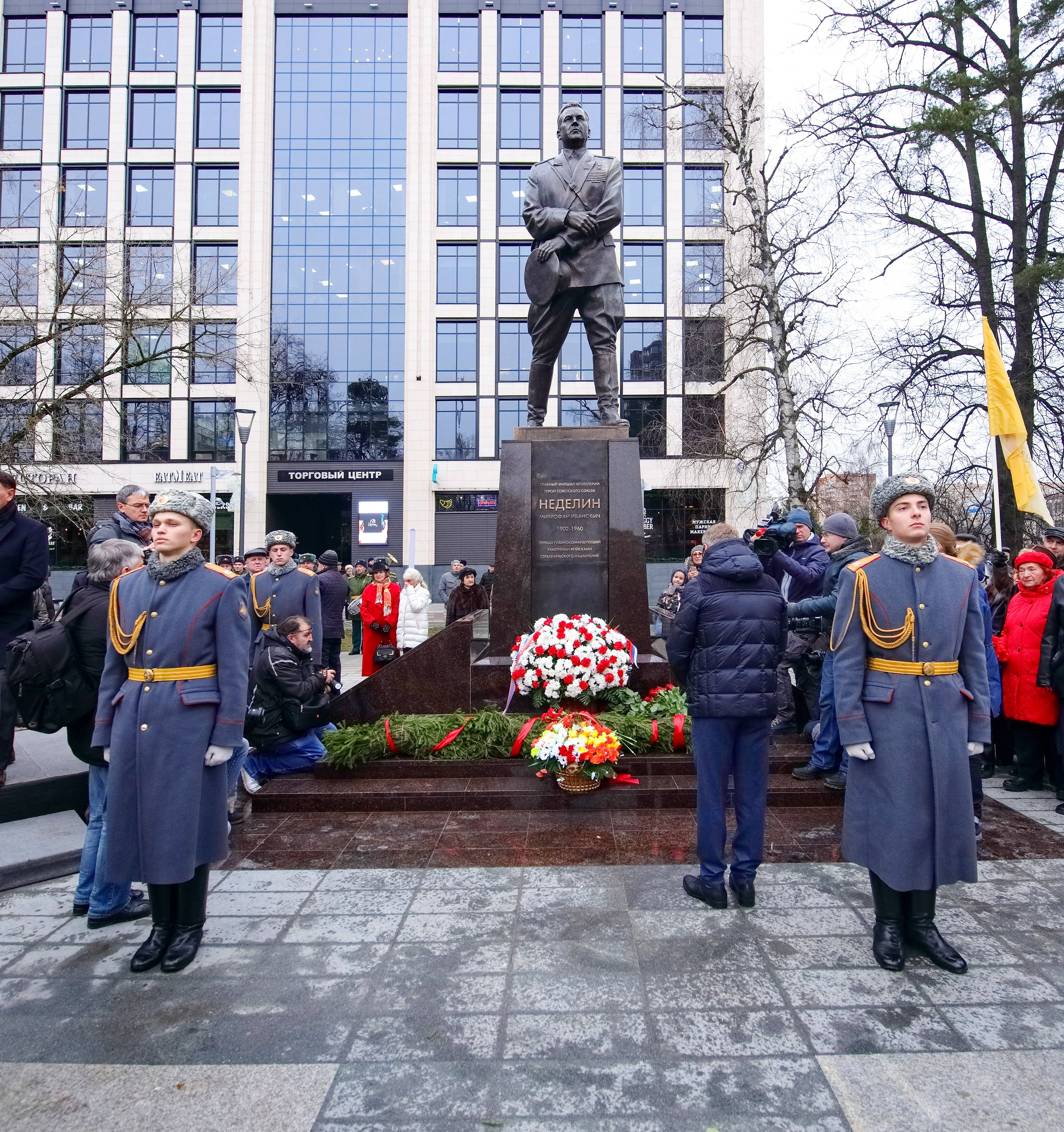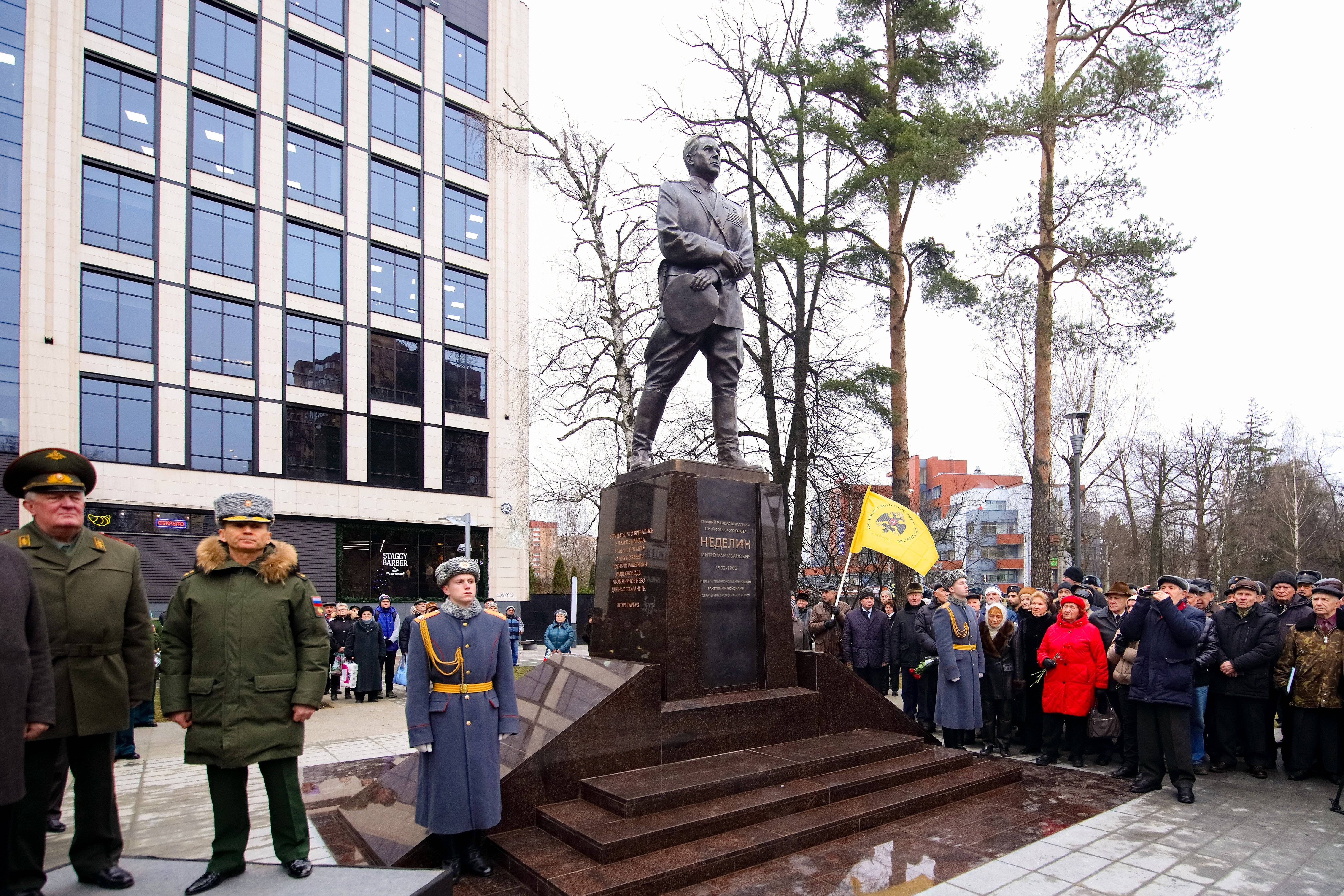 Памятник главному маршалу артиллерии Митрофану Неделину был открыт 17 декабря 2019 года в Подмосковном городе Одинцово. Монумент установлен Российским военно-историческим обществом. Автор памятника – Денис Анатольевич Стритович.