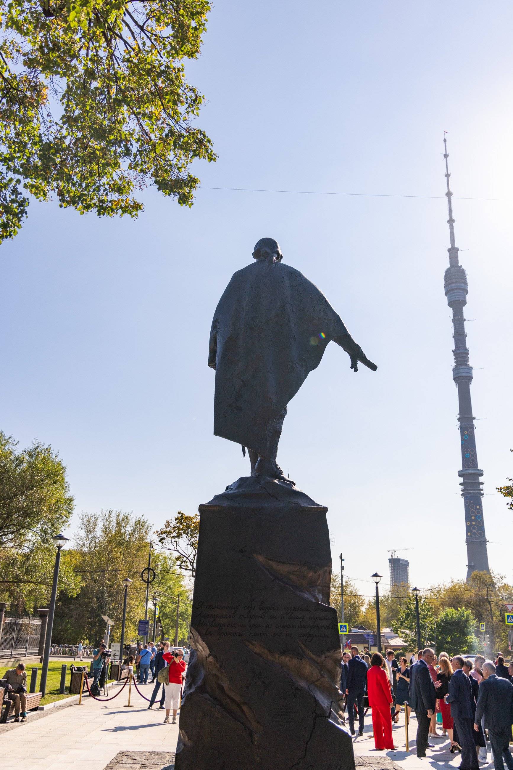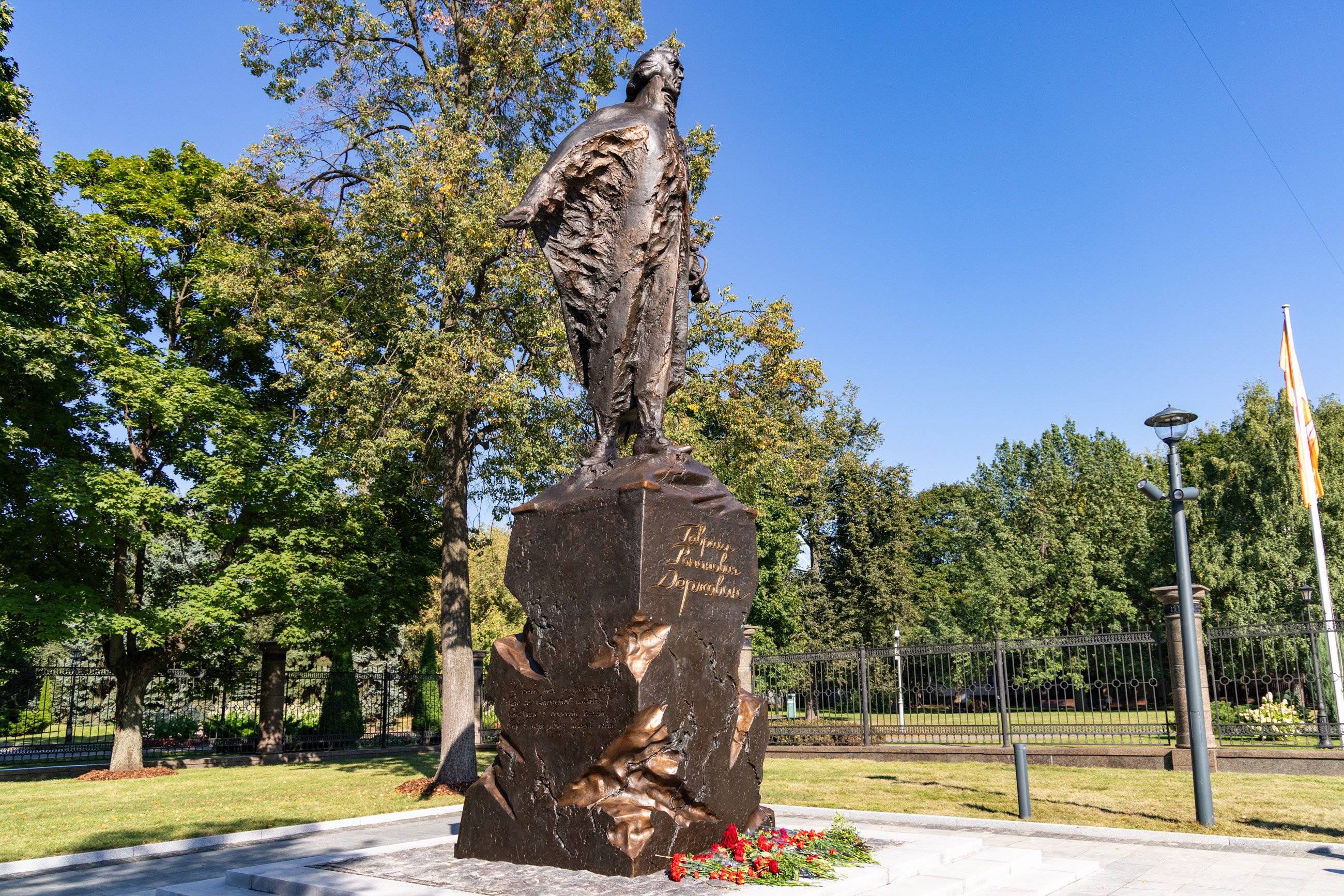 Увековечил образ в бронзе скульптор Николай Жуков. Высота скульптурной композиции вместе с постаментом 8-метров.