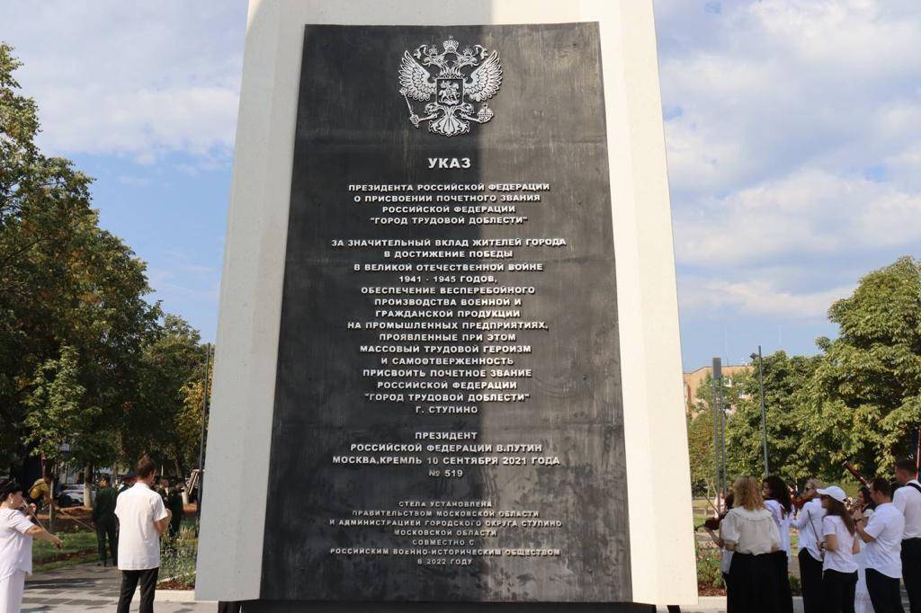 Стела «Ступино - город трудовой доблести» была открыта 26 августа 2022 года в подмосковном городе Ступино. Инициатором установки монумента является Российское военно-историческое общество. Автор объекта – Денис Анатольевич Стритович.