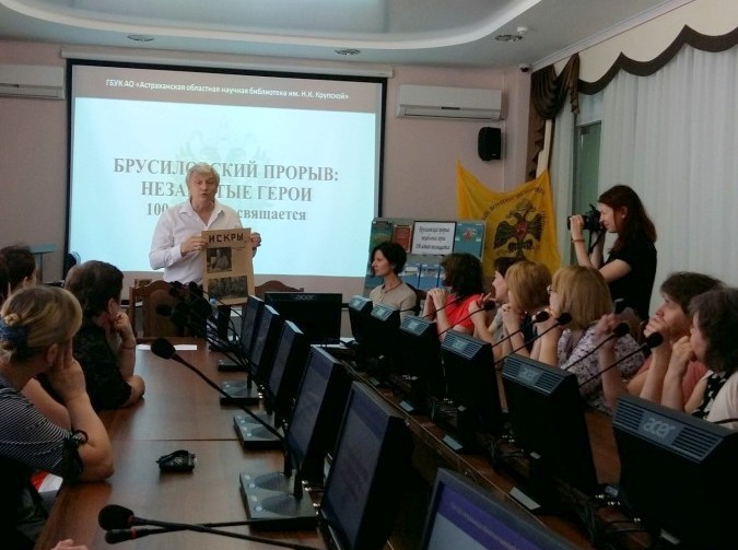 В Областной детской библиотеке Астрахани состоялся исторический час, посвященный 100-летию Брусиловского прорыва. Цикл «Уроков мужества» познакомил юный посетителей библиотеки с героическим прошлым земляков. Для взрослой аудитории в Астраханской областной научной библиотеке им. Н.К. Крупской состоялась презентация выставочного проекта «Брусиловский прорыв: незабытые герои». В рамках мероприятия состоялось выступление члена Астраханского регионального отделения РВИО Владимира Немчинова. Он рассказал участникам презентации о том, какое значение для военного искусства имела наступательная операция Юго-Западного фронта русской армии под командованием генерала Брусилова в период Первой мировой войны. В ходе выступления Владимир Юрьевич представил редкие документы из личной коллекции, в том числе газету «Искры» за 1916 год с фотоотчётом по Брусиловскому прорыву и фотографией генерала. В заключение патриотической акции состоялась демонстрация документального фильма о Брусиловском прорыве.