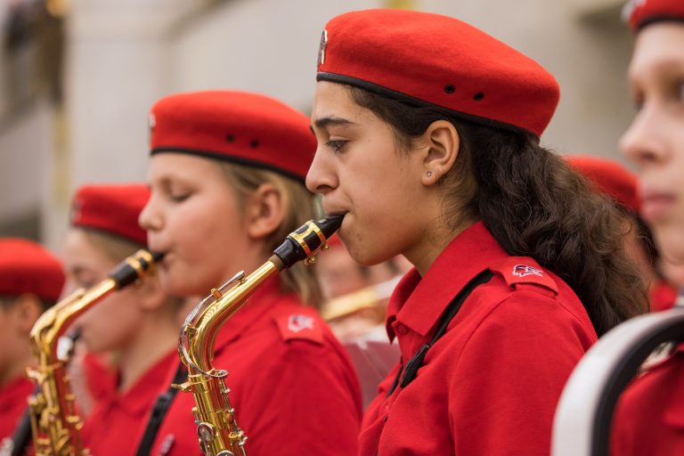 В этом году в состав сводного детского духового оркестра «Юные фанфары России» вошли более 30 оркестров Москвы и Подмосковья. В ходе концерта одна за другой сменялись песни военных лет, патриотические и русские народные песни. Кульминацией программы стал гимн Москвы, который одновременно исполнили более 1000 начинающих музыкантов. Сводный детский духовой оркестр «Юные фанфары России» также сыграл шесть музыкальных произведений, в том числе Марш защитников Москвы».