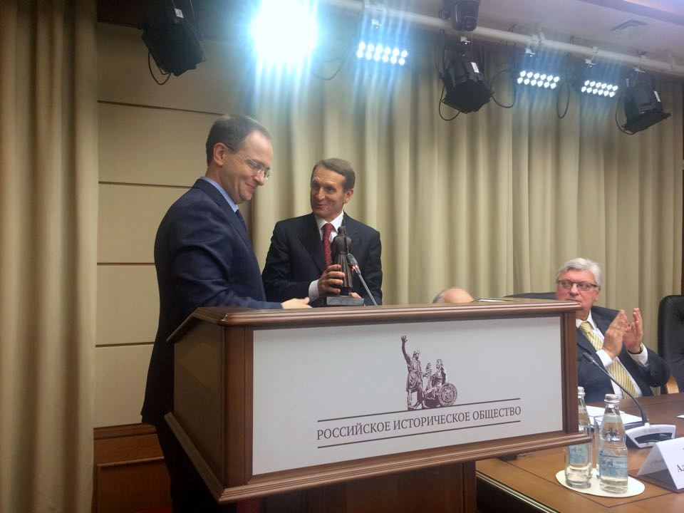 Владимир Мединский поздравил организацию со 150-летием, передав в дар Председателю Российского исторического общества Сергею Нарышкину уменьшенную копию памятника «Прощание славянки», установленного РВИО на площади Белорусского вокзала в Москве.
