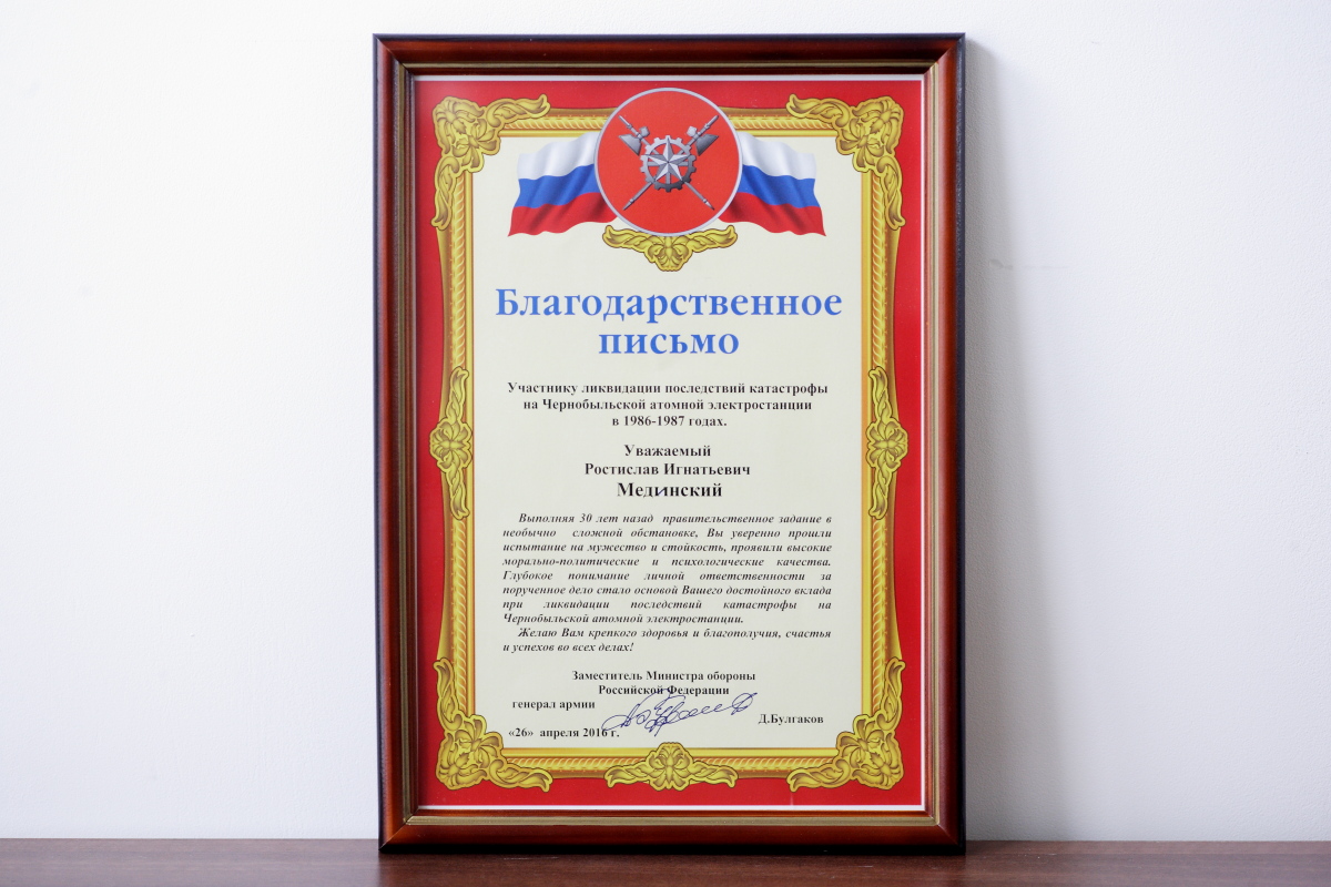 - Выполняя правительственное задание в необычно сложной обстановке, Вы уверенно прошли испытание на мужество и стойкость, проявили высокие морально-политические и психологические качества. Глубокое понимание личной ответственности за порученное дело стало основой Вашего достойного вклада при ликвидации последствий катастрофы на Чернобыльской атомной электростанции, - говорится в письме.