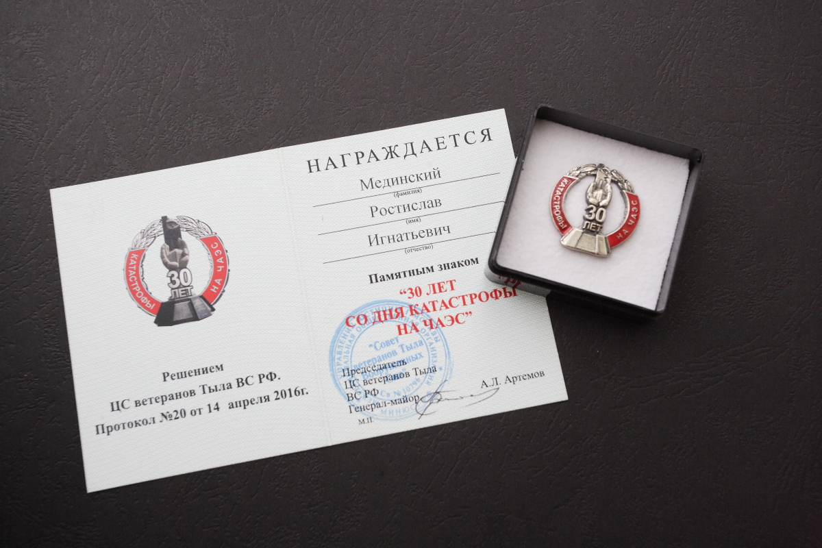 Решением Центрального Совета ветеранов Тыла Вооруженных Сил Российской Федерации Ростислав Мединский награжден памятным знаком «30 лет со дня катастрофы на ЧАЭС».