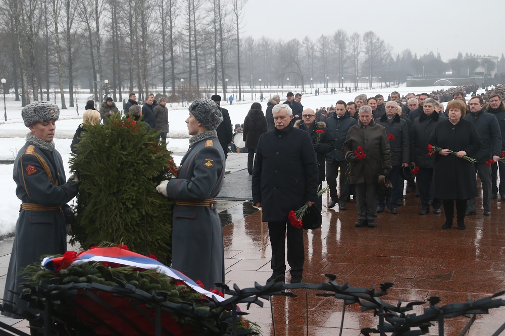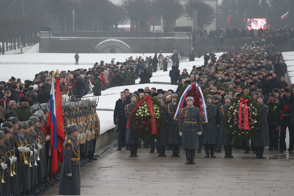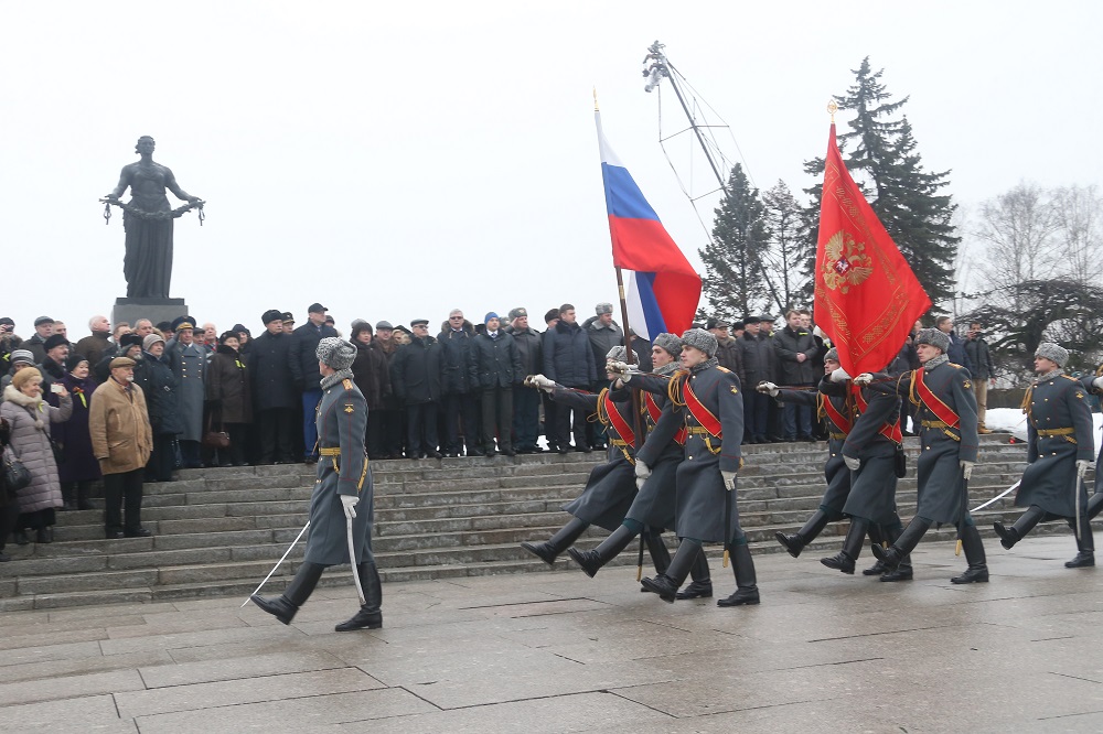 Венок к подножию монумента Матери-Родины возложили губернатор Георгий Полтавченко и члены Правительства Санкт-Петербурга, полномочный представитель Президента России в Северо-Западном федеральном округе Николай Цуканов, председатель Конституционного Суда РФ Валерий Зорькин и судьи Конституционного Суда, председатель Законодательного Собрания Санкт-Петербурга Вячеслав Макаров и депутаты Законодательного Собрания Санкт-Петербурга, члены правительства и депутаты Законодательного Собрания Ленинградской области, представители командования Западного военного округа и главного командования Военно-Морского Флота России, активисты Российского военно-исторического общества.