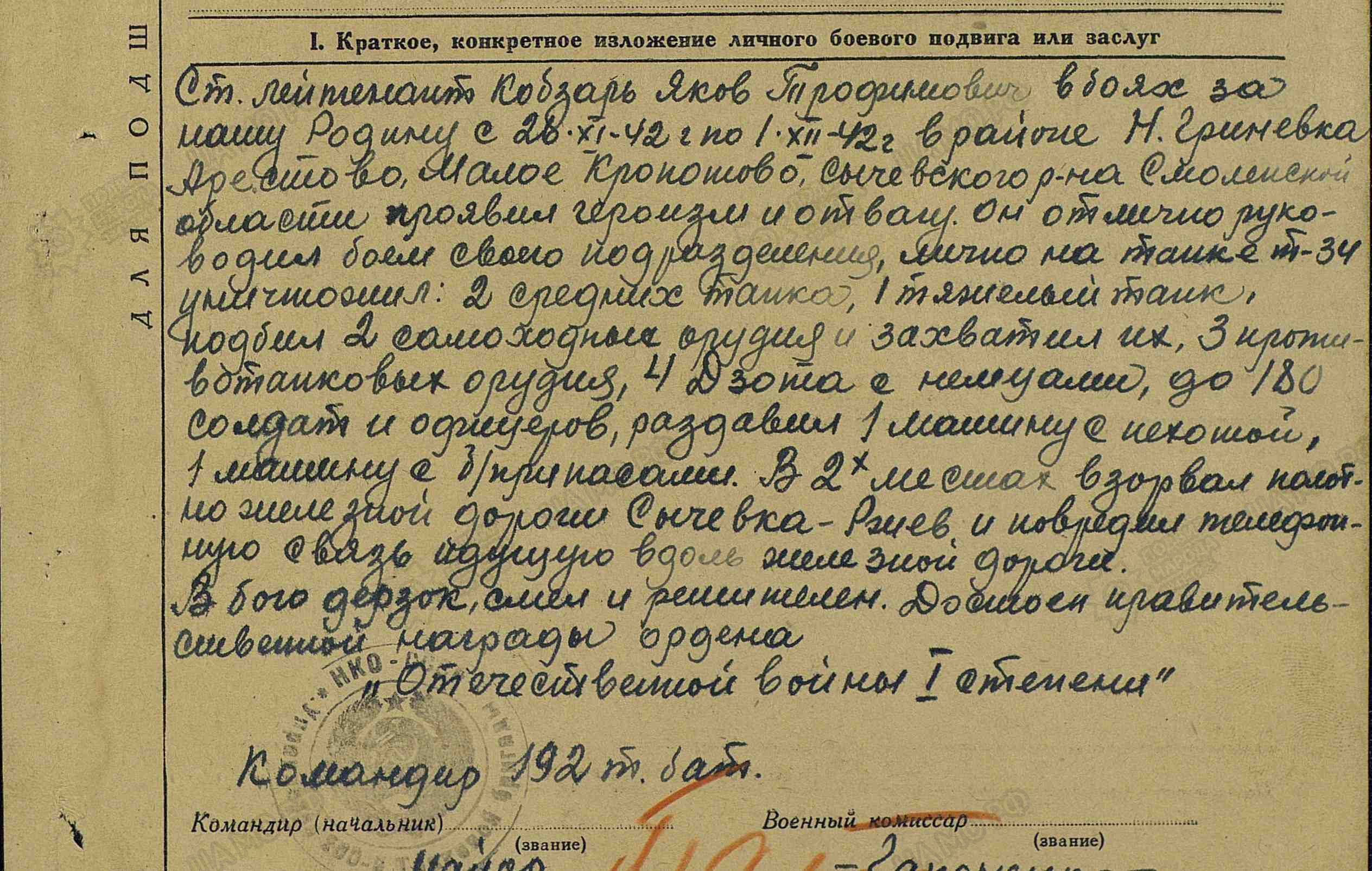 8 июля 1943 года у села Верхопенье командир танковой роты Кобзарь остался один против 30 немецких танков. Умело управляя своей «тридцатьчетверкой», уничтожил 17 танков противника – и погиб смертью героя. Но звание Героя Советского Союза было присвоено Якову Трофимовичу Кобзарю только в 1990 году.