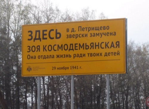 В мае 2016 года на съезде с трассы А-108 в сторону деревни Петрищево РВИО установлен «Маяк памяти» – дорожный знак, посвященный подвигу Зои Космодемьянской. Надпись на знаке гласит: «Здесь в деревне Петрищево зверски замучена Зоя Космодемьянская. Она отдала жизнь ради твоих детей. 29 ноября 1941 года».