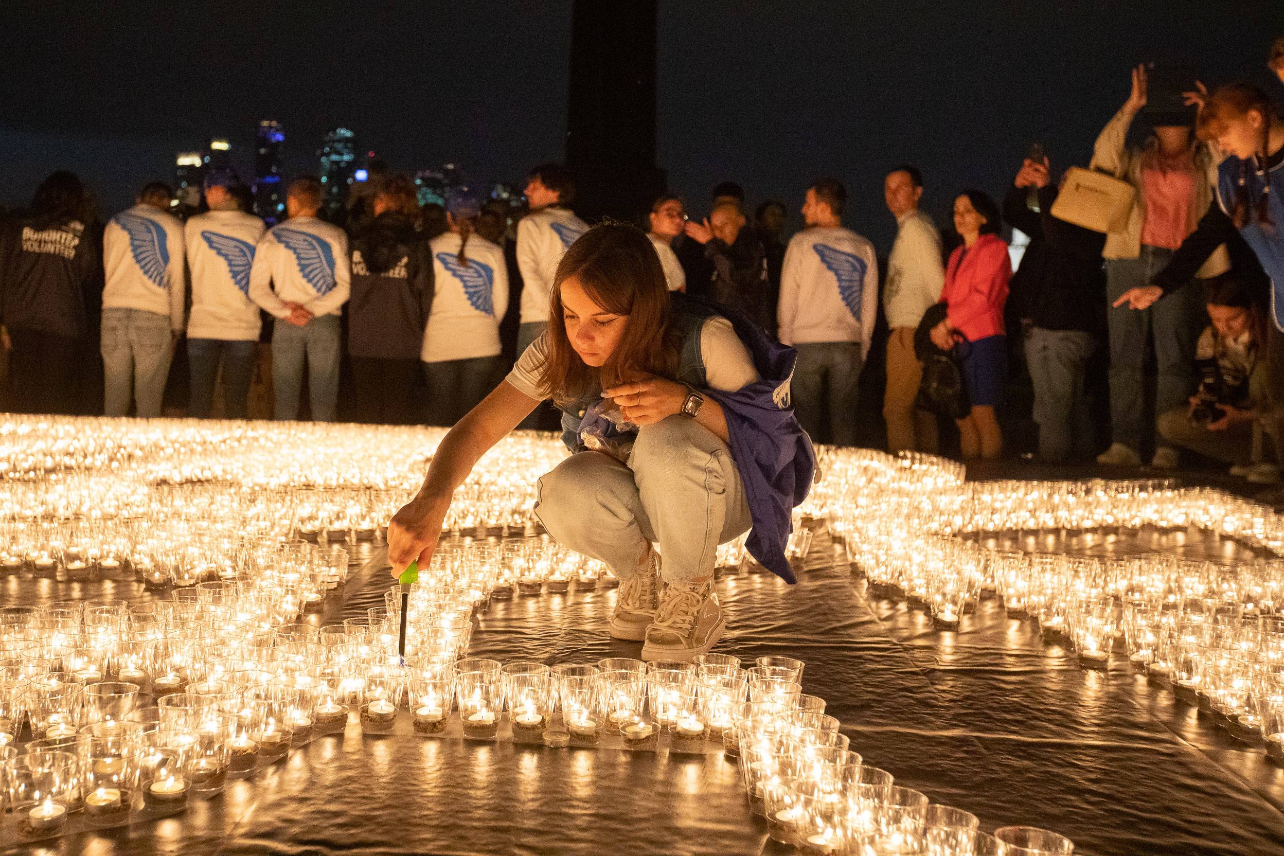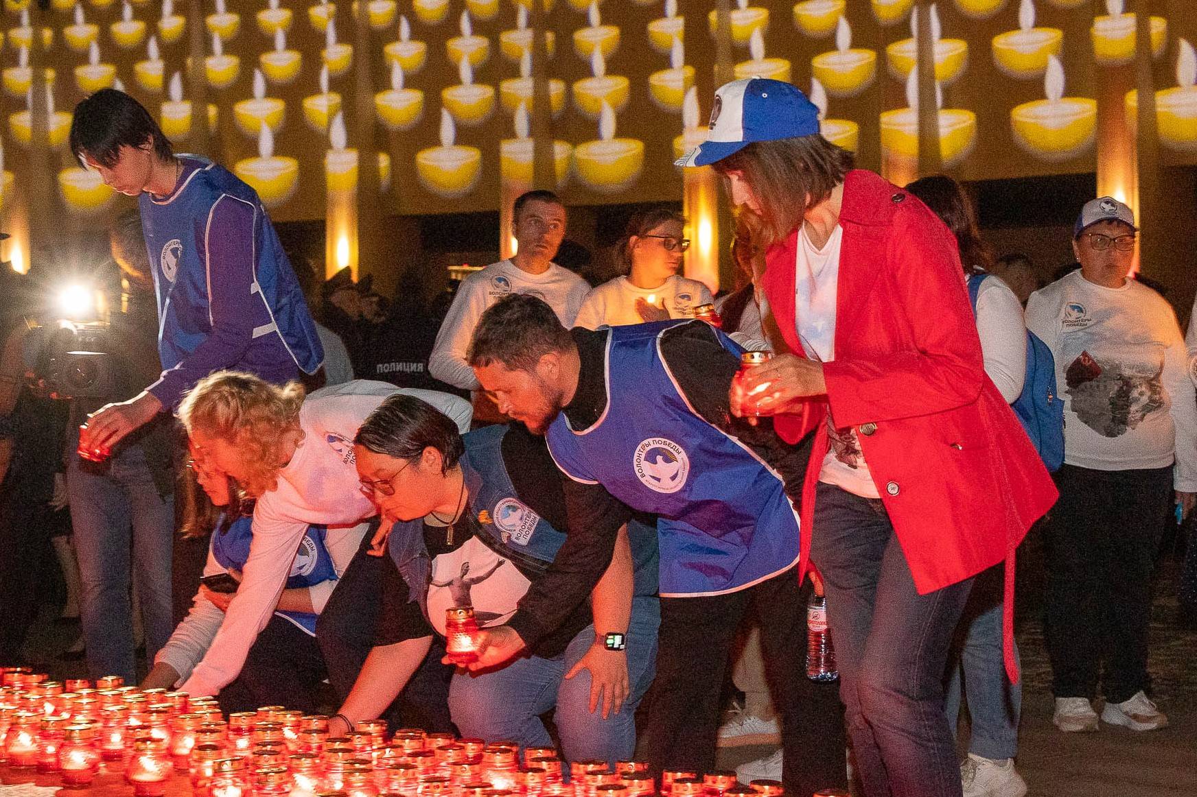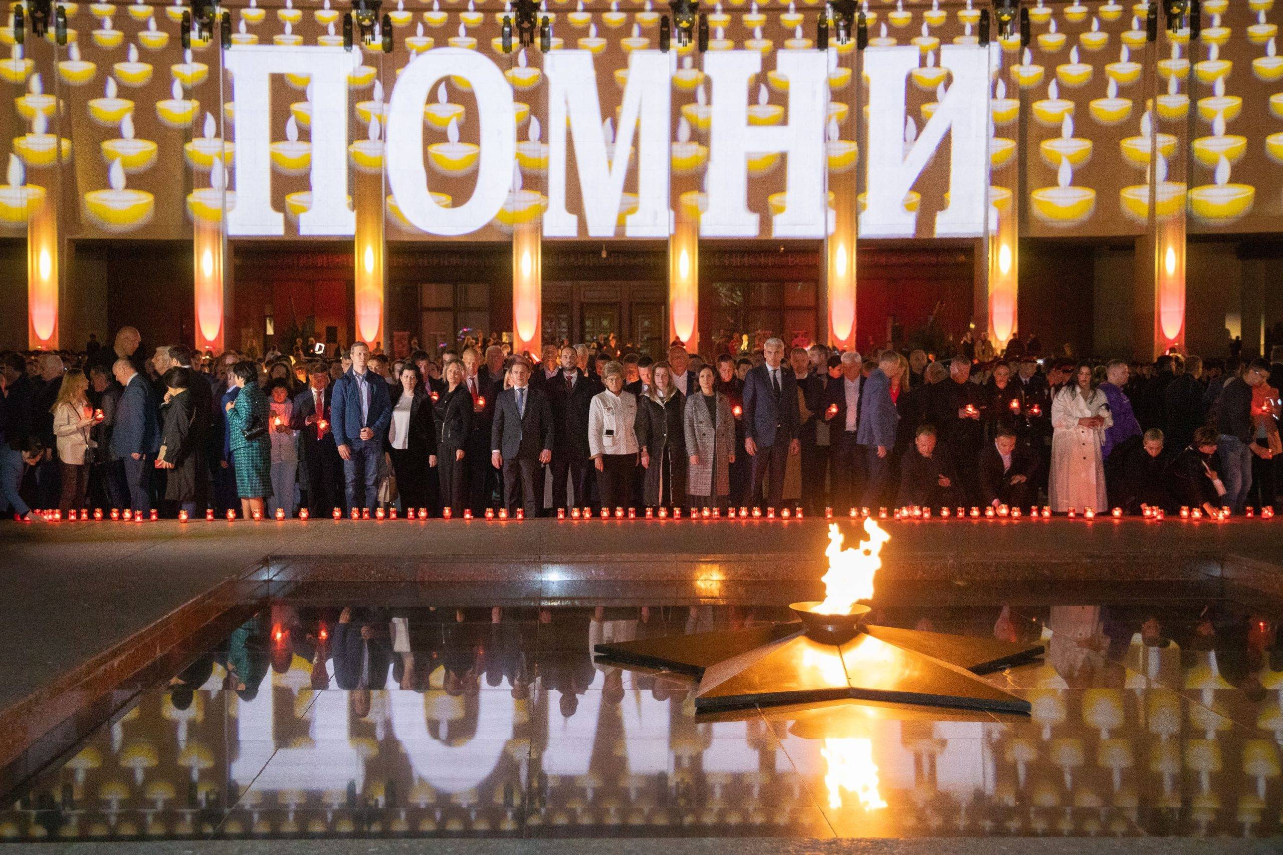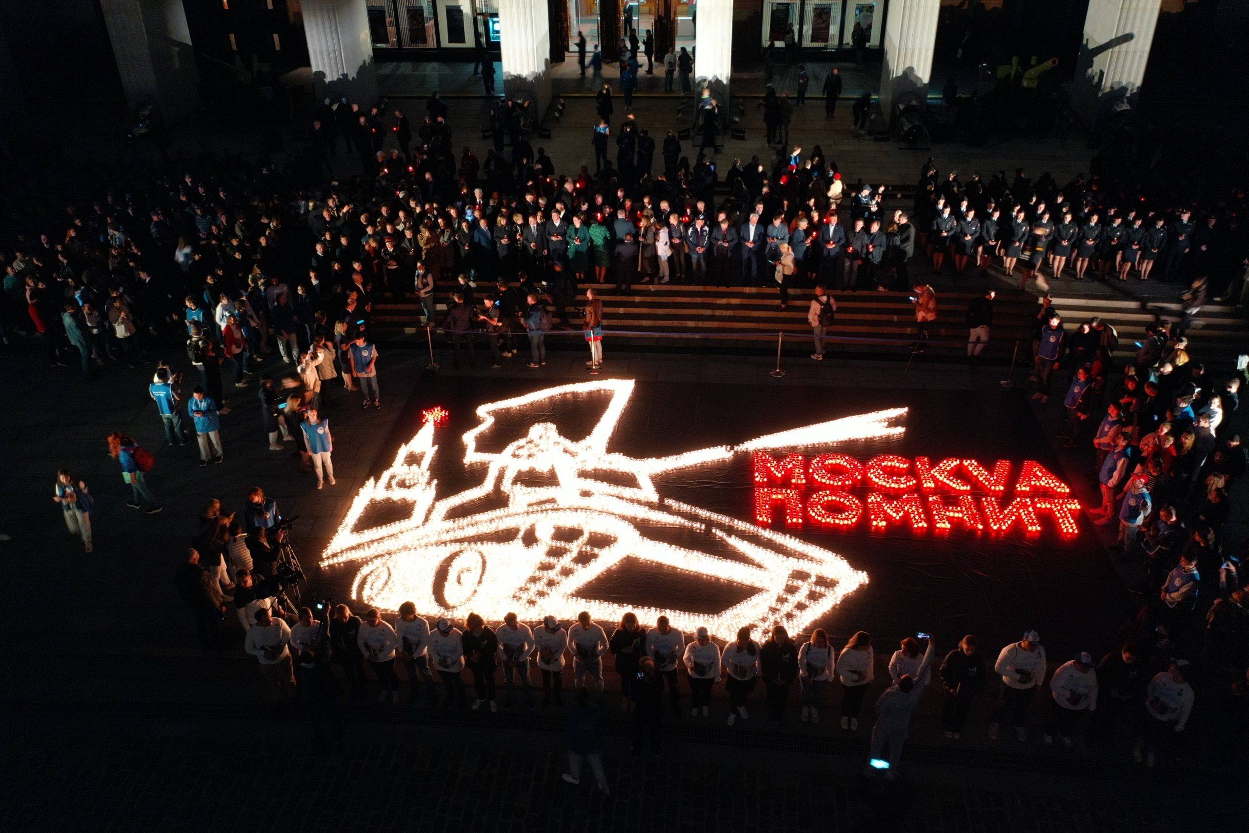 Представители органов исполнительной власти, общественных организаций, депутаты, волонтеры, военнослужащие Росгвардии, МЧС, Семеновского полка, сотрудники Генеральной прокуратуры, МВД, ГУ МВД по г. Москве, курсанты Военного университета в знак памяти по числу дней войны зажгли 1418 свечей.