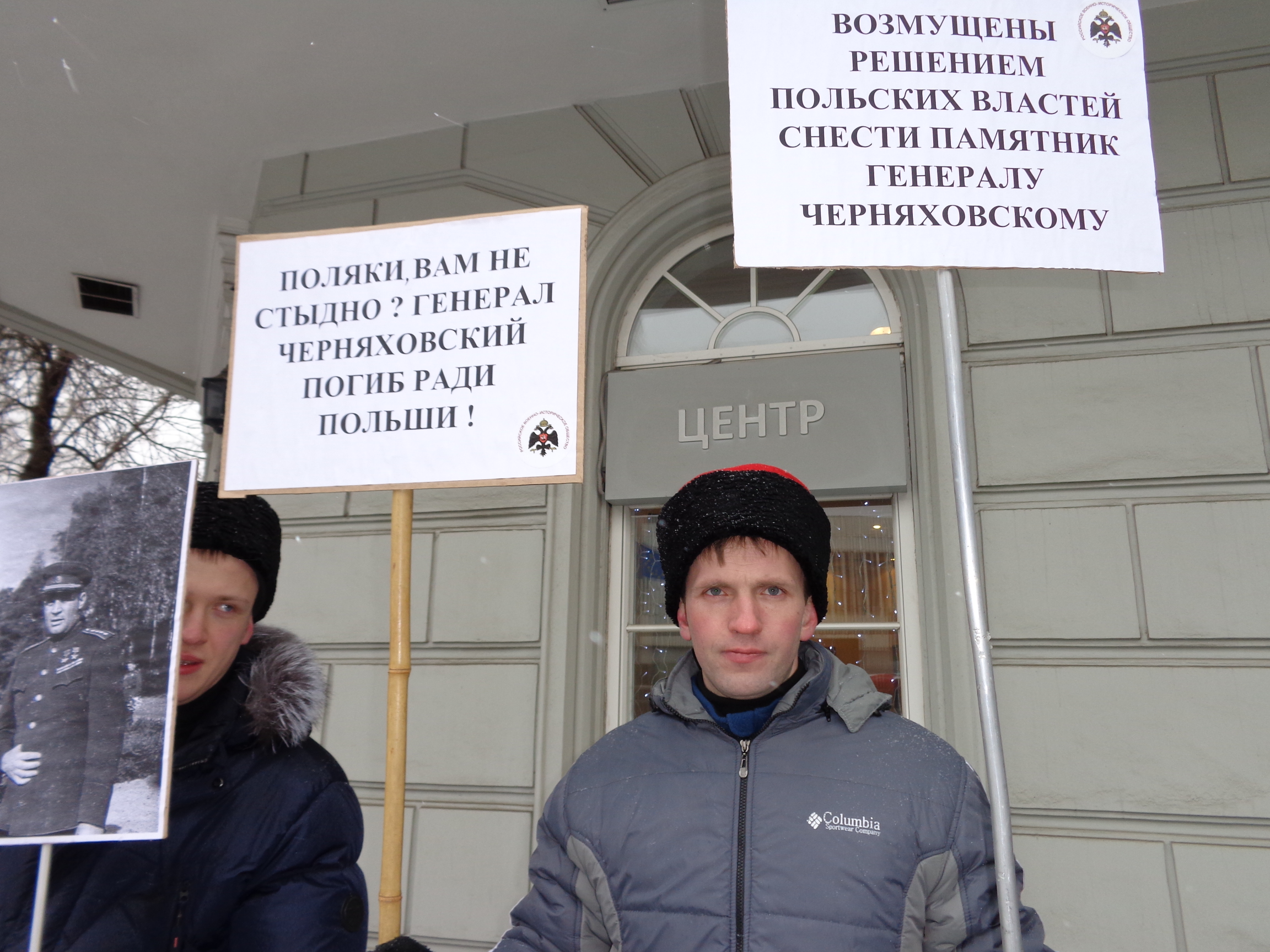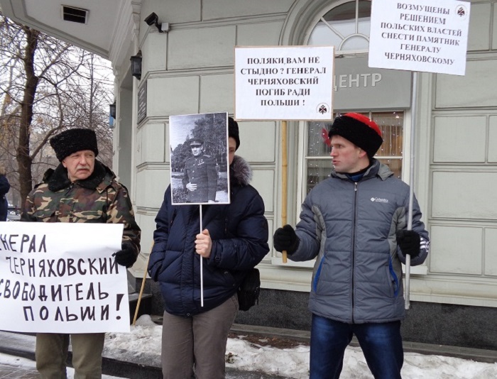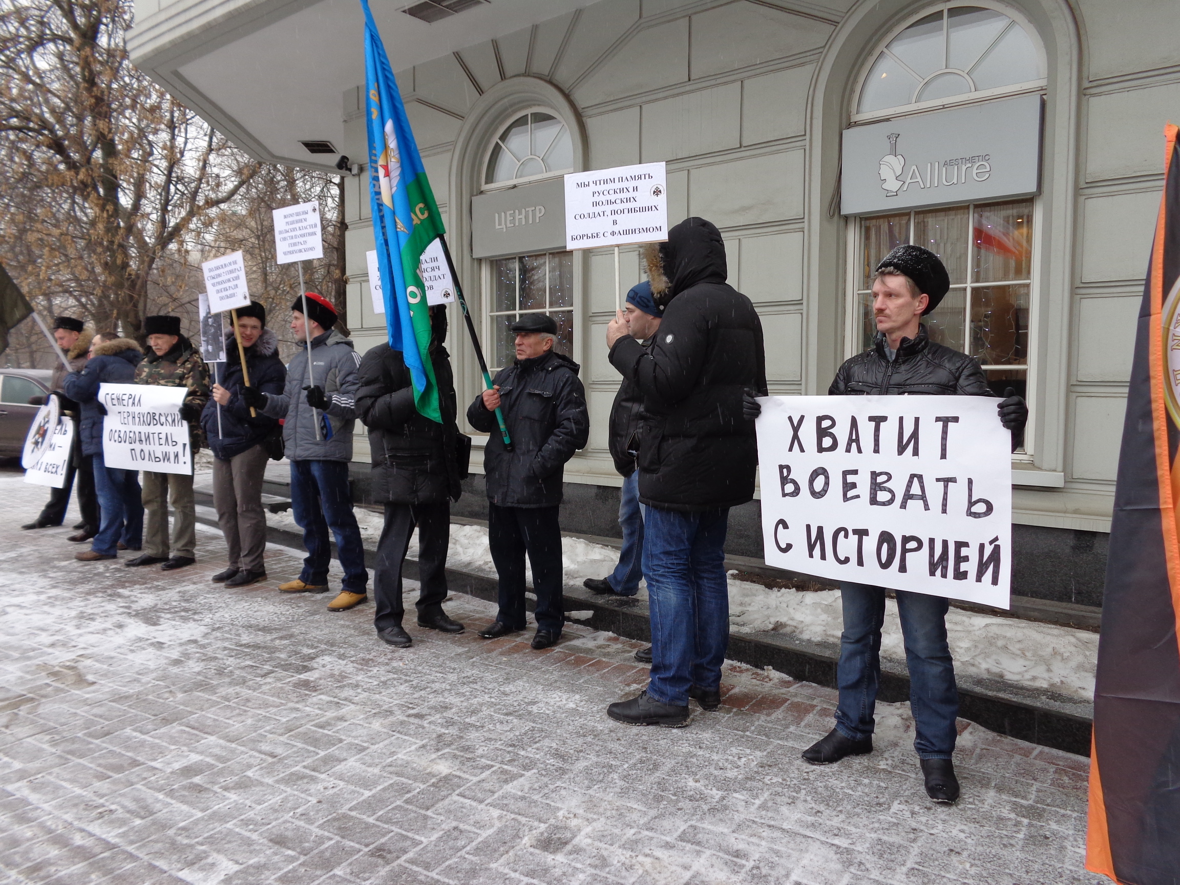 11 февраля представители Российского военно-исторического общества вышли в пикет к посольству Польши в Москве. К активистам присоединились российские десантники и казаки. Поводом для пикета стало недавнее решение польских властей – депутатского корпуса города Пененжо – снести памятник генералу Ивану Черняховскому, погибшему в окрестностях именно этого города во время освобождения Польши от фашистов.