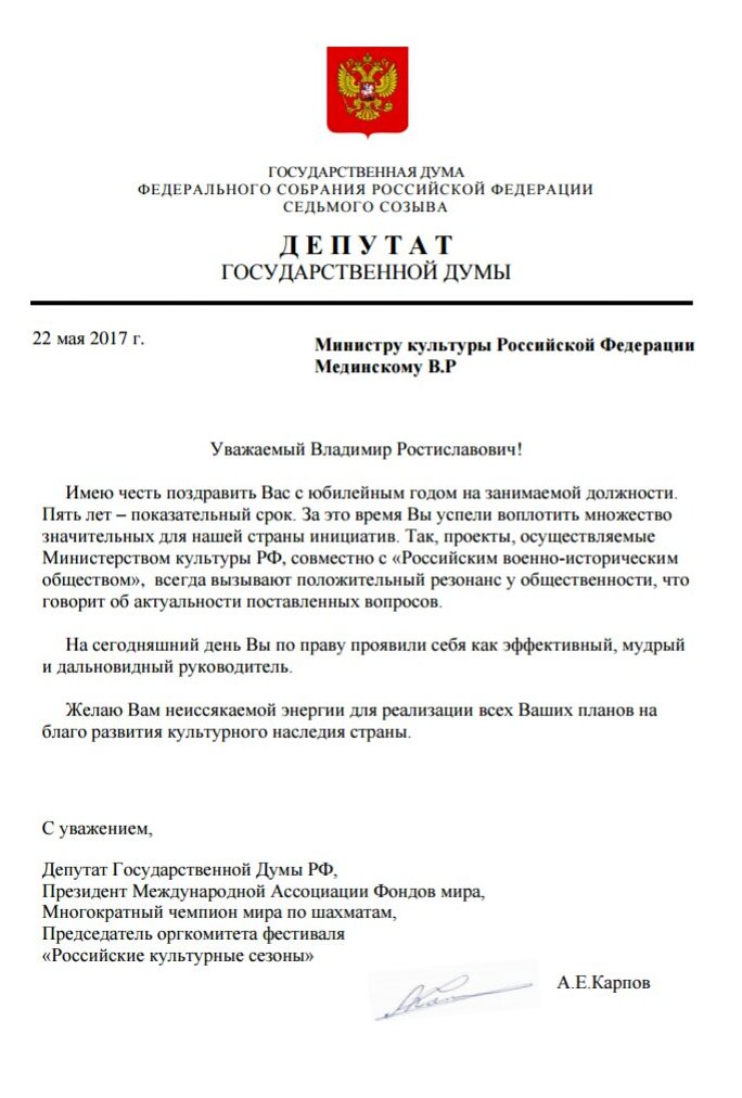 В адрес Министра культуры Российской Федерации, Председателя Российского военно-исторического общества Владимира Мединского пришло поздравительное письмо от Депутата Государственной Думы РФ, Президента Международной Ассоциации Фондов мира, Многократного чемпиона Мира по шахматам, Председателя оргкомитета фестиваля «Культурные сезоны» Анатолия Карпова.