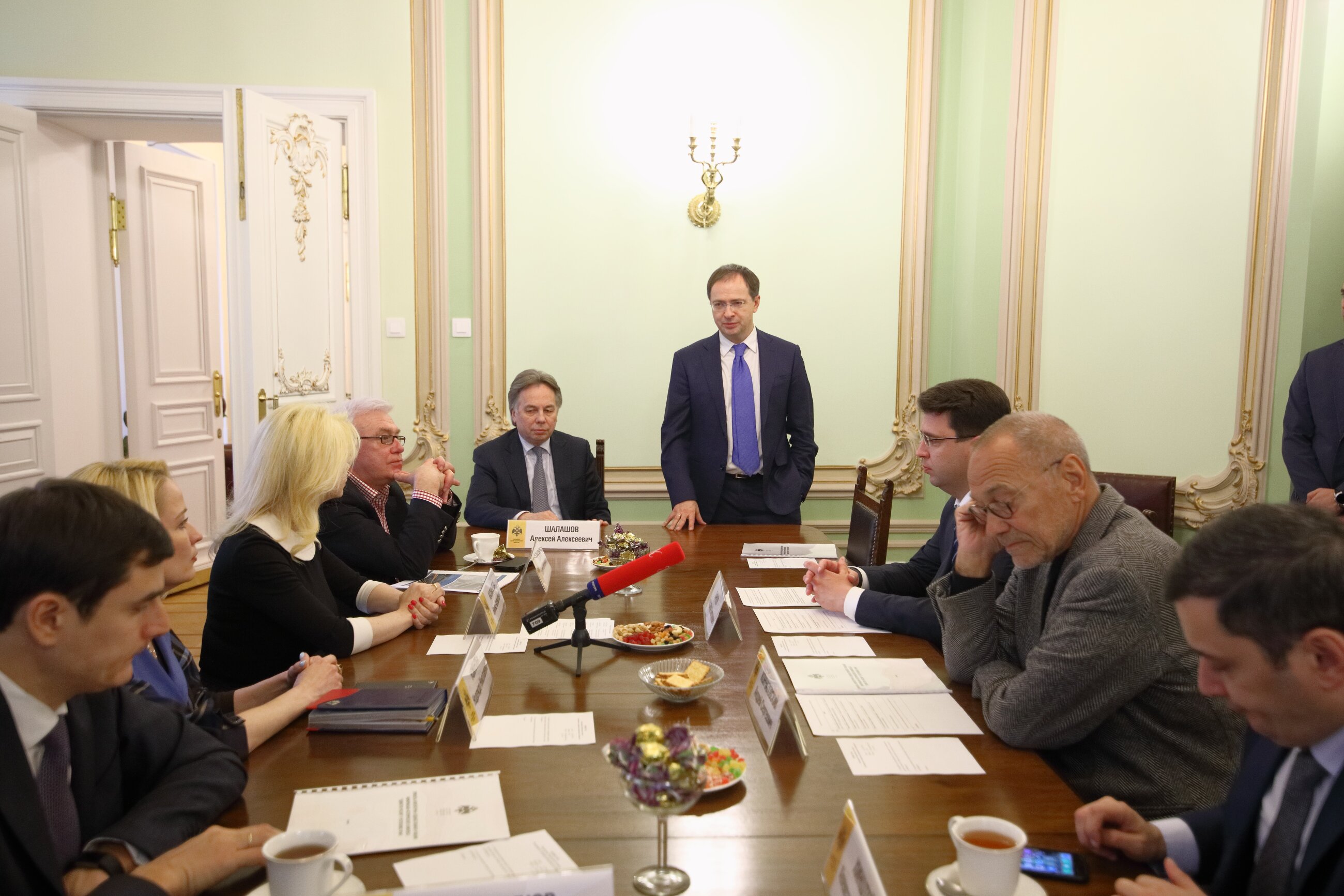 Председатель Российского военно-исторического общества, Министр культуры РФ Владимир Мединский кратко поприветствовал собравшихся. Провел совещание Председатель Творческого совета РВИО по монументальному искусству Андрей Кончаловский.