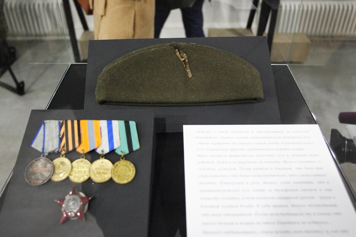 В качестве экспонатов представлены: ордена и медали, командировочные предписания для выполнения специальных заданий редакции на фронте, фото Маршала Толбухина, подписанное для Ольги Ландер. Самые трогательные экспонаты: письма-треугольники с фронта и пилотка, пробитая осколком – тогда Ландер чудом удалось спастись при бомбежке.