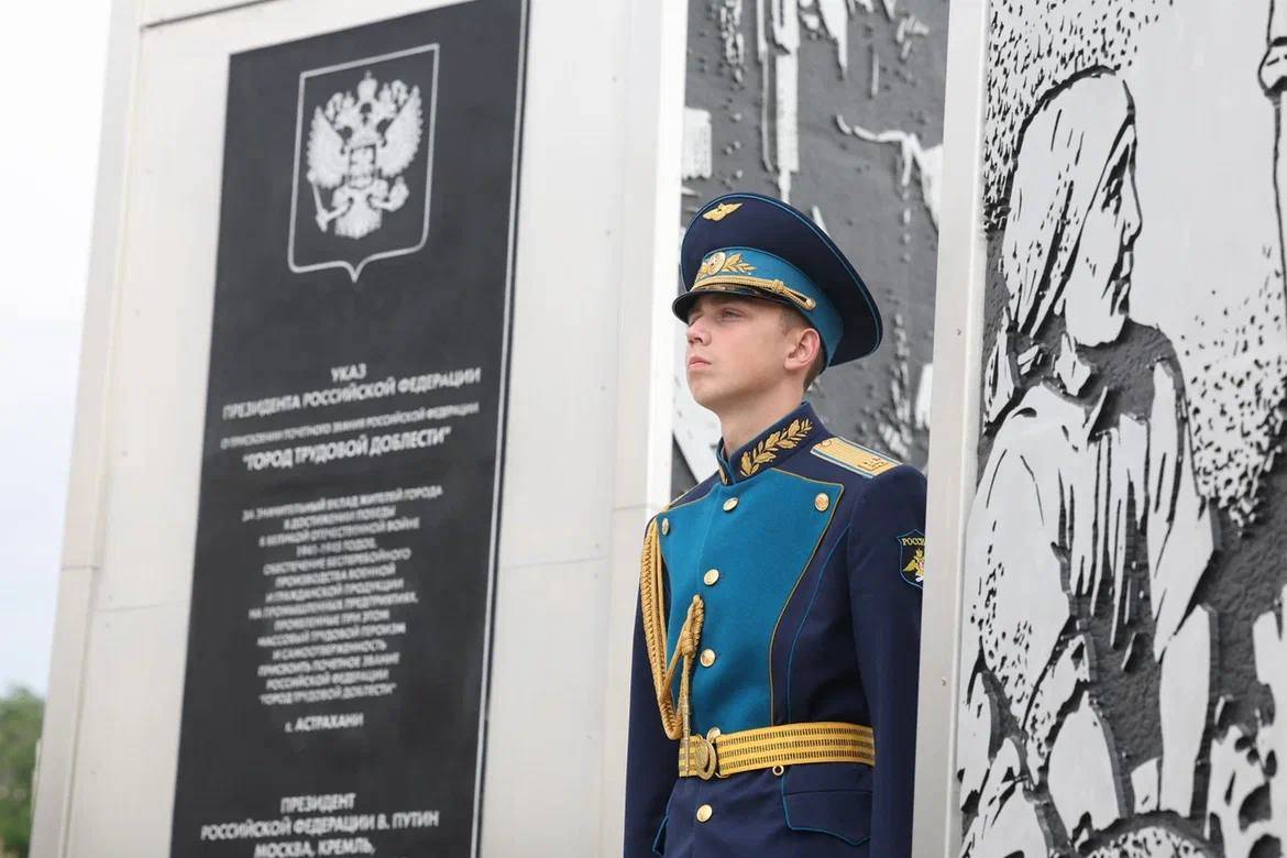 В Астрахани у Центрального стадиона на улице Латышева торжественно открыли стелу «Город трудовой доблести». Мемориальная композиция установлена Российским военно-историческим обществом.