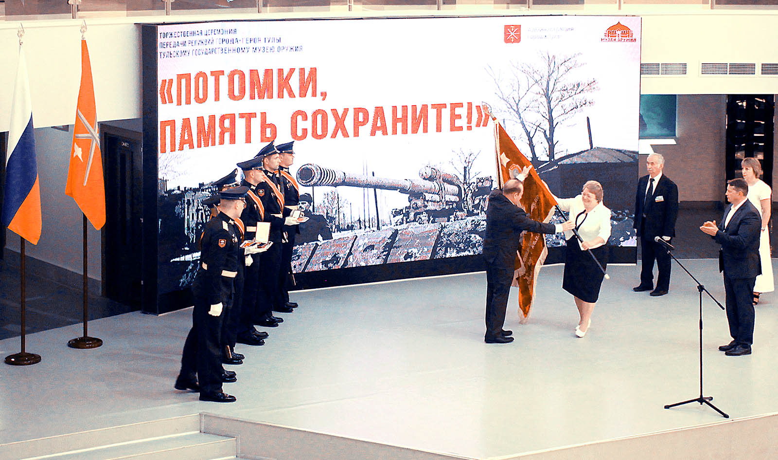 Глава города-героя Тулы Юрий Цкипури и глава администрации города Тулы Евгений Авилов торжественно передали директору музея Надежде Калугиной Знамя города-героя Тулы, медаль «Золотая Звезда», орден Ленина и ценные документы.