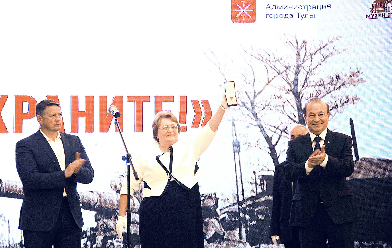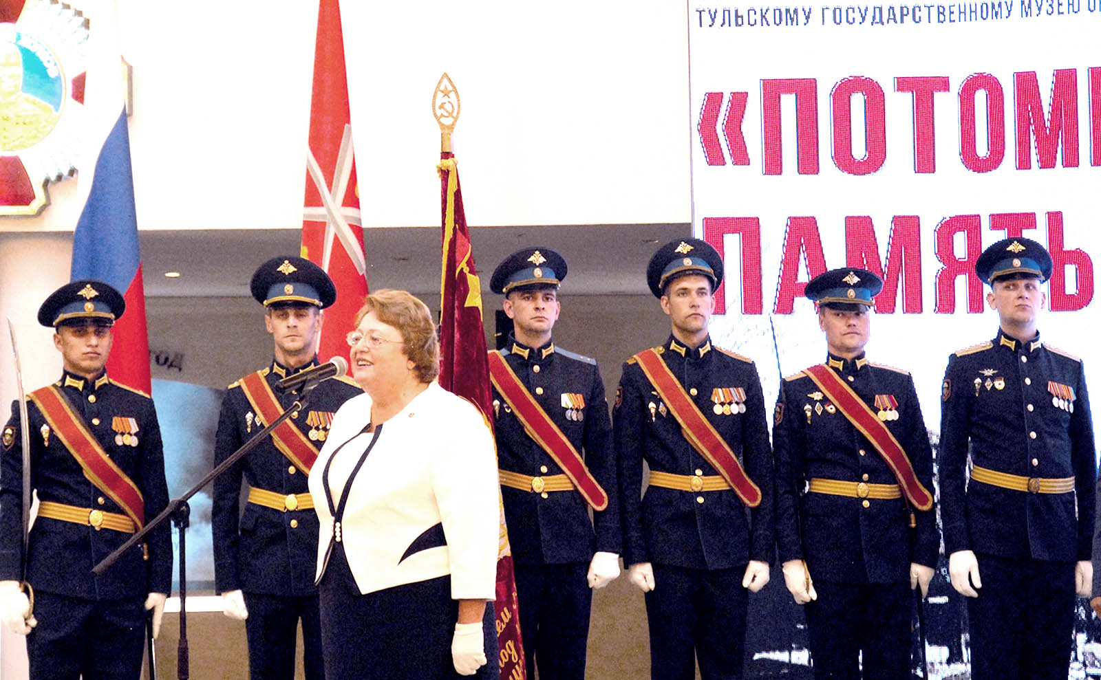 В своем выступлении директор Тульского государственного музея оружия, Почетный гражданин Тульской области Надежда Калугина передала благодарность Министра культуры РФ, Председателя РВИО Владимира Мединского руководству города Тулы и ветеранам Великой Отечественной войны за решение доверить Музею оружия реликвии, связанные с присвоением Туле высшего звания «Город-Герой».