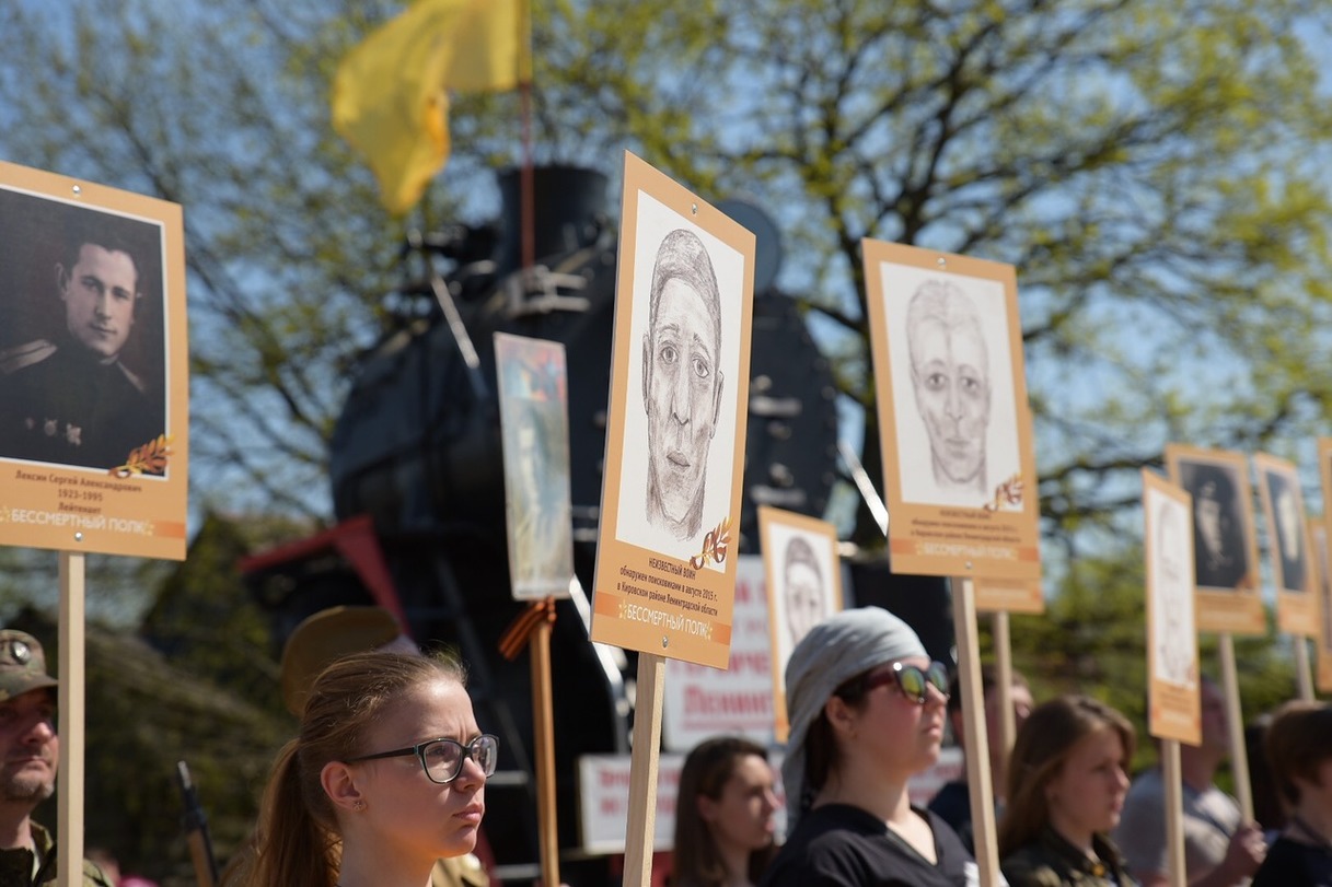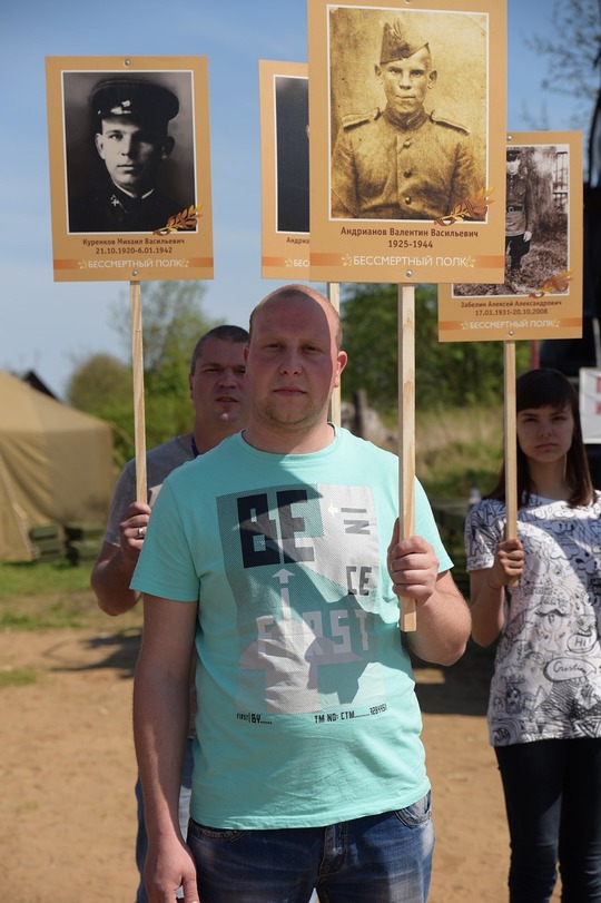 Участники лагеря прошли маршем с портретами своих родных и неизвестных солдат, обнаруженных поисковиками в течение нескольких экспедиций. Антропологи по специальной технологии восстанавливают облик бойцов и рисуют их портреты.