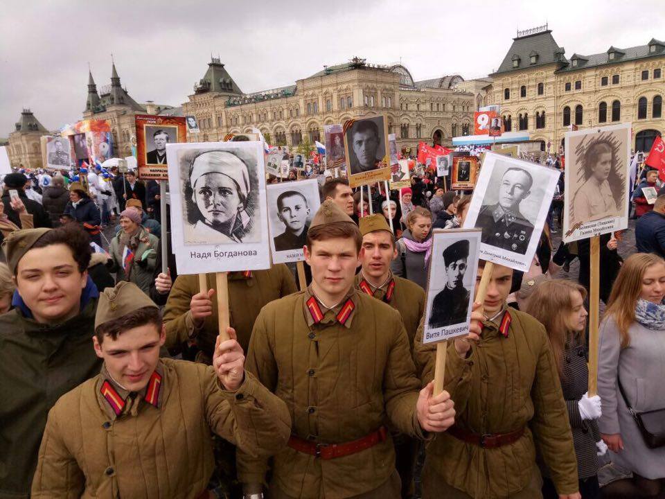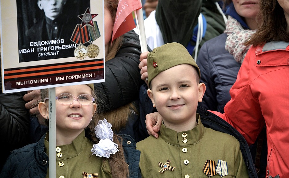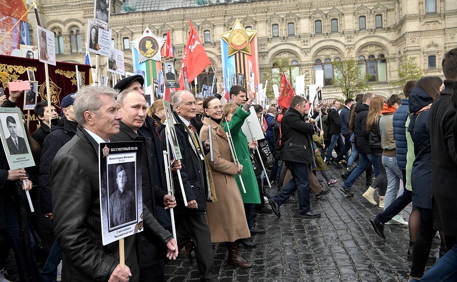Традиционно во главе торжественной колонны с участниками акции прошел Президент России Владимир Путин с портретом своего отца-фронтовика. В этом году в составе первой колонны «Бессмертного полка» прошли 40 школьников из смены военно-исторического лагеря Российского военно-исторического общества «Память поколений».