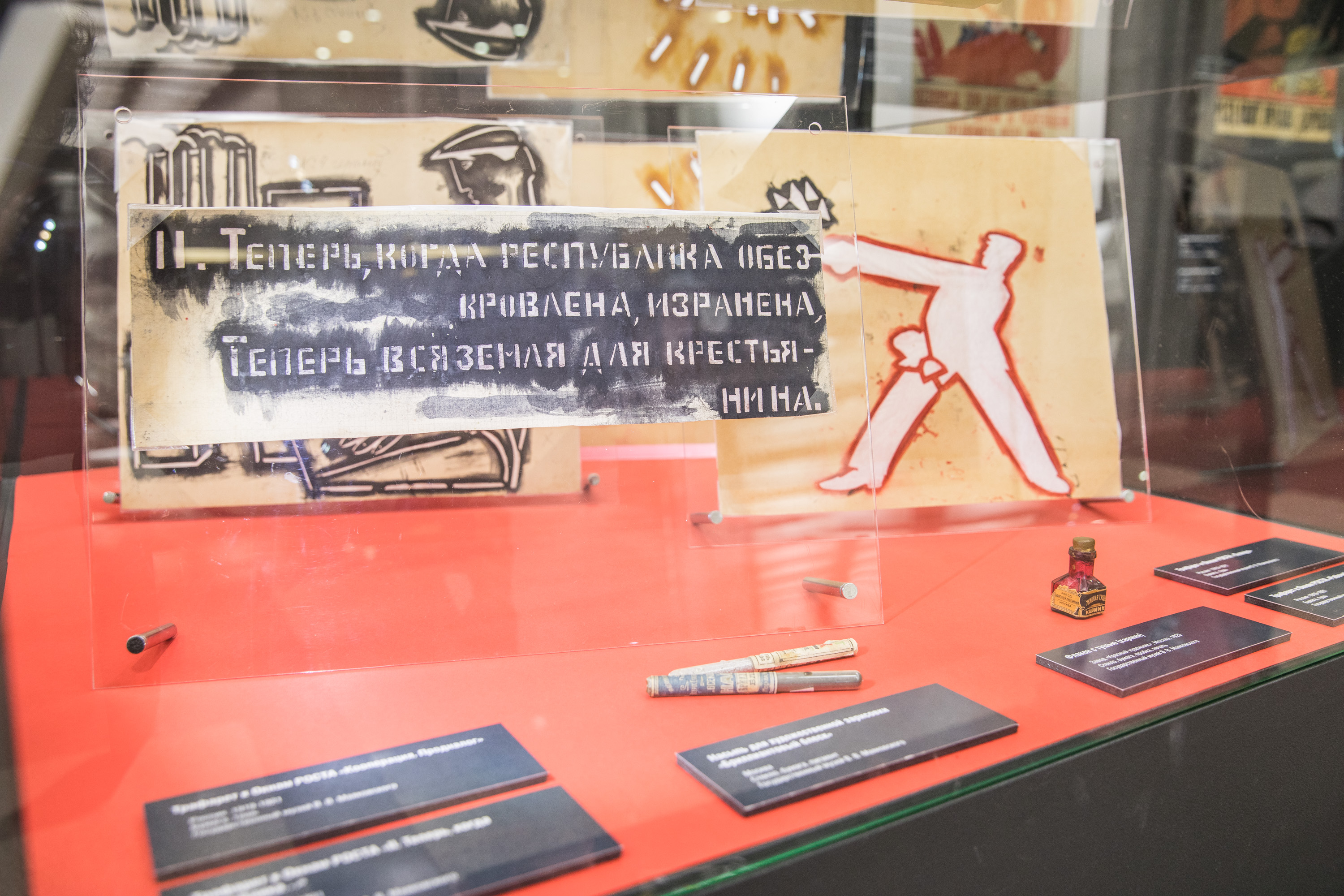Дополняют экспозицию фотографии и документы, рассказывающие о создании «агиток» первой половины ХХ века. Кроме того, в витринах выставлены инструменты, краски и кисти, принадлежавшие известным художникам, а также личные вещи Владимира Маяковского и Лили Брик. Часть раритетов демонстрируется впервые.