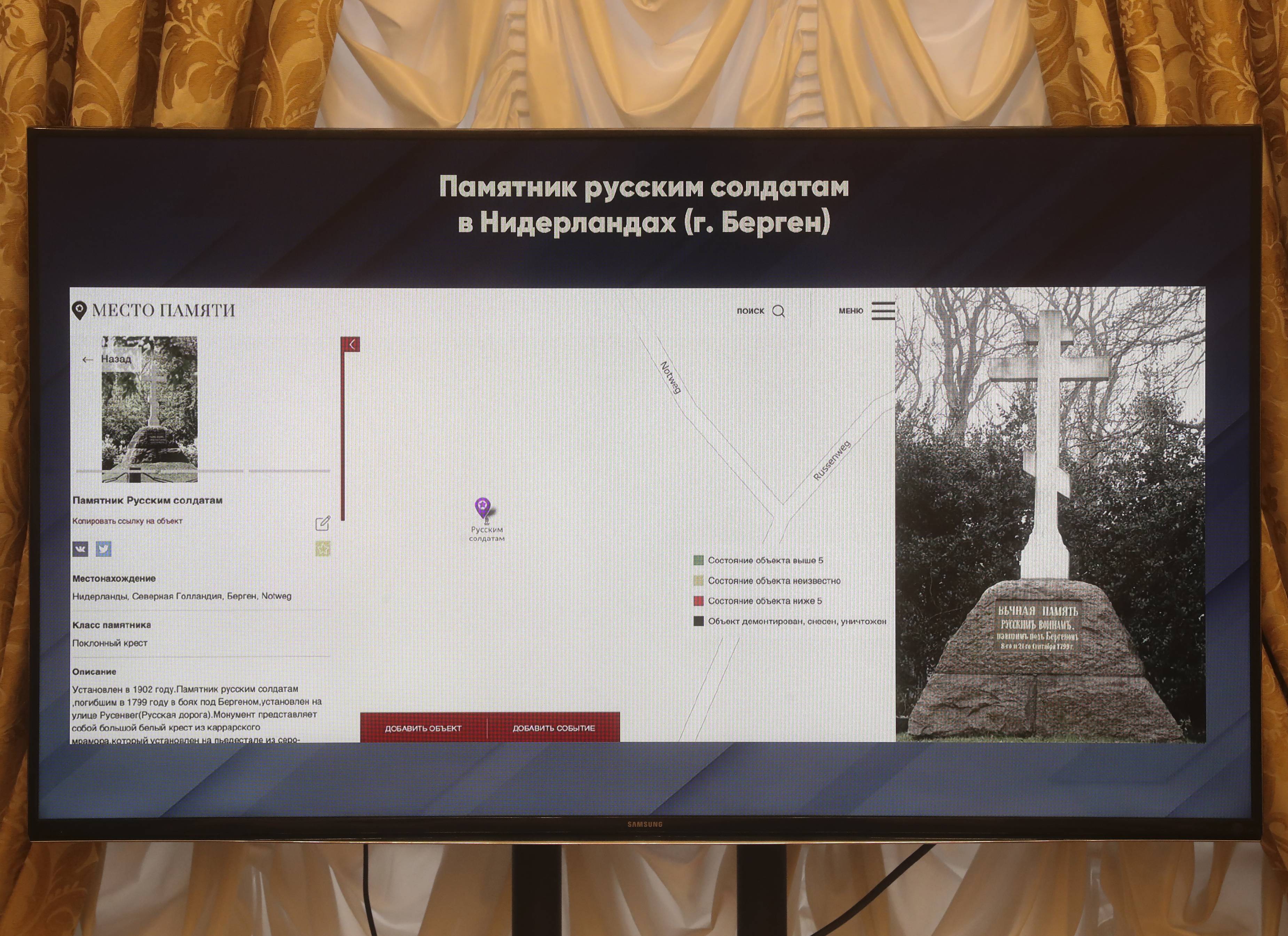 - Речь идет о новой цифровой платформе, в основу которой мог быть положен существующий с 2017 года портал Российского военно-исторического общества (РВИО) - "Место памяти". На текущий момент эта большая электронная карта содержит сведения почти о 90 тысячах различных памятниках, расположенных как в нашей стране, так и за рубежом, - сообщил Председатель Российского исторического общества (РИО) Сергей Нарышкин. - Считаю целесообразным воспользоваться этим инструментом, чтобы в обозримые сроки создать функциональный и обновляемый перечень утраченных мемориальных объектов в недружественных странах, который объединил бы и данные Министерства иностранных дел, и сведения Министерства обороны России, и исторические материалы, собранные нашими волонтёрами.
