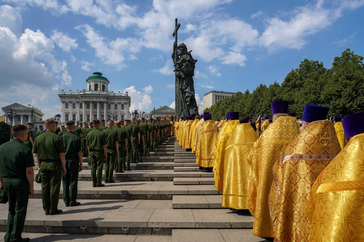 У памятника, где собрались жители и гости столицы, был совершен молебен равноапостольному князю Владимиру. Богослужение транслировалось в прямом эфире телеканалов «Россия 24», «Союз» и «Спас», а также на официальном портале Русской Православной Церкви Патриархия.ru. Трансляция была выведена на большой экран, установленный на площади перед памятником.