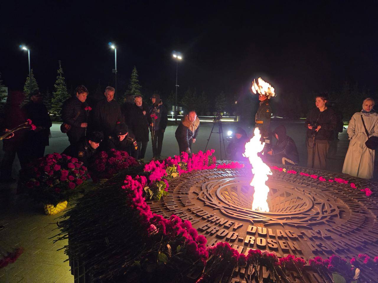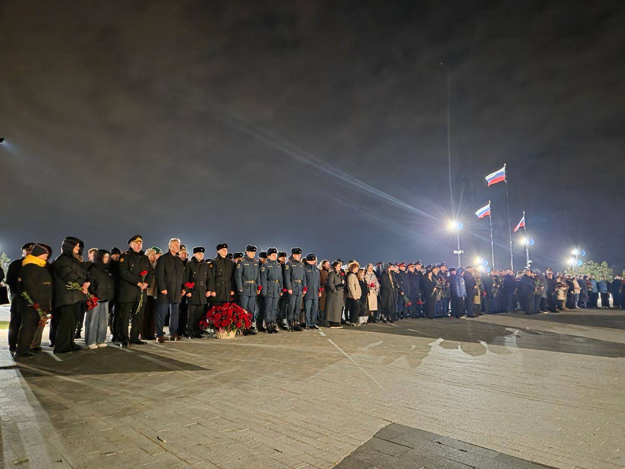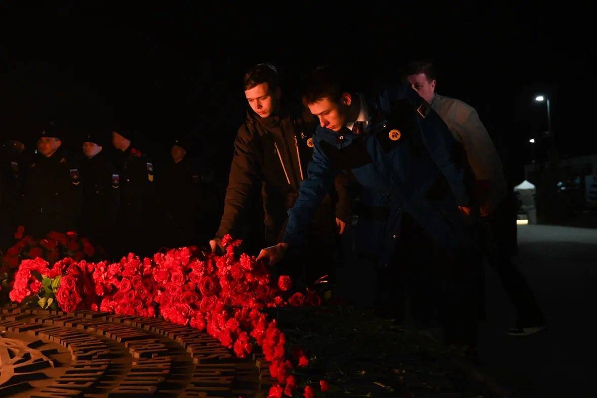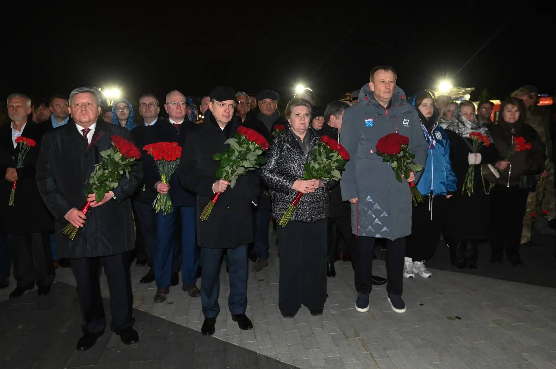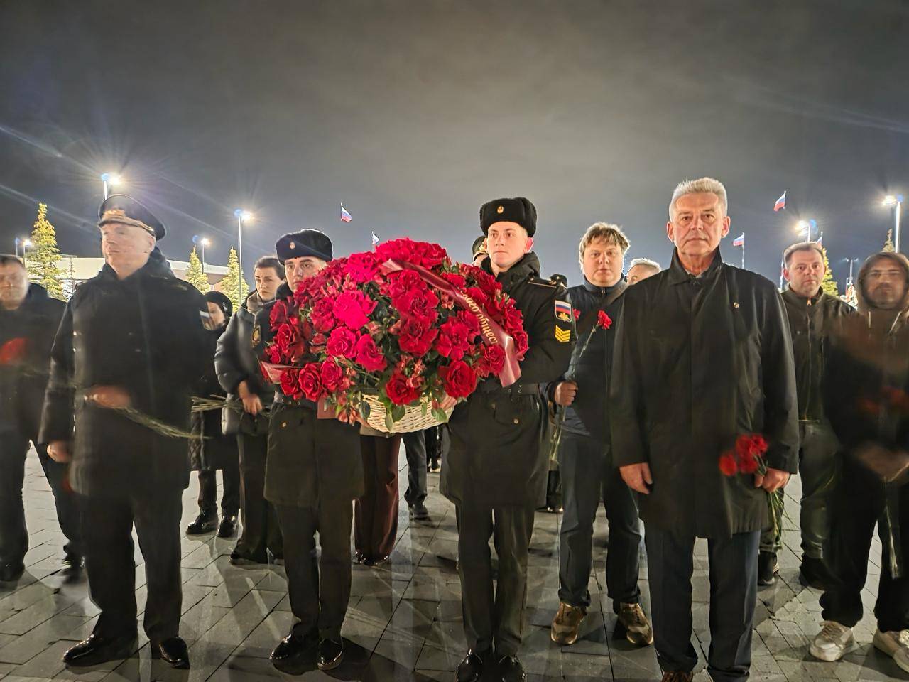Участники церемонии возложили цветы к Вечному огню и почтили Память убиенных Минутой молчания. Воинские почести погившим отдали Военный оркестр штаба Северо-Западного округа Росгвардии и почётный караул.