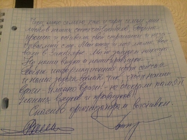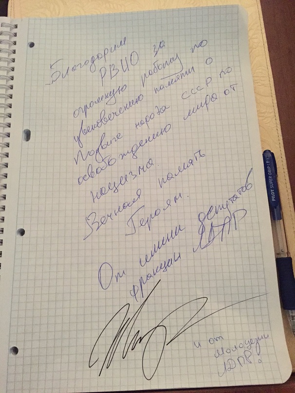 - Через мою семью, как и через семьи миллионов наших соотечественников война прошла и оставила свой страшный и незабываемый след, - оставил запись в книге отзывов руководитель фракции "Единой России" в Госдуме Владимир Васильев. - Мой отец и моя мать воевали в Заполярье. Мы не забудем никогда.. Но наши внуки и наши правнуки... Война информационная идет сейчас, и наша задача сделать так, чтобы наши враги - именно враги! - не обокрали память наших внуков и правнуков!