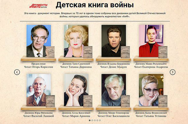 На сайте «Аргументы и факты» продолжается уникальный проект - 35 известных российских артистов, телеведущих, спортсменов, режиссёров читают дневники из «Детской книги войны». Все вступительные главы к ней прочёл легендарный диктор Игорь Кириллов. Каждый будний день 22 июня на сайте звучит новый дневник, открывающий ещё одну страничку правды о той страшной войне.
