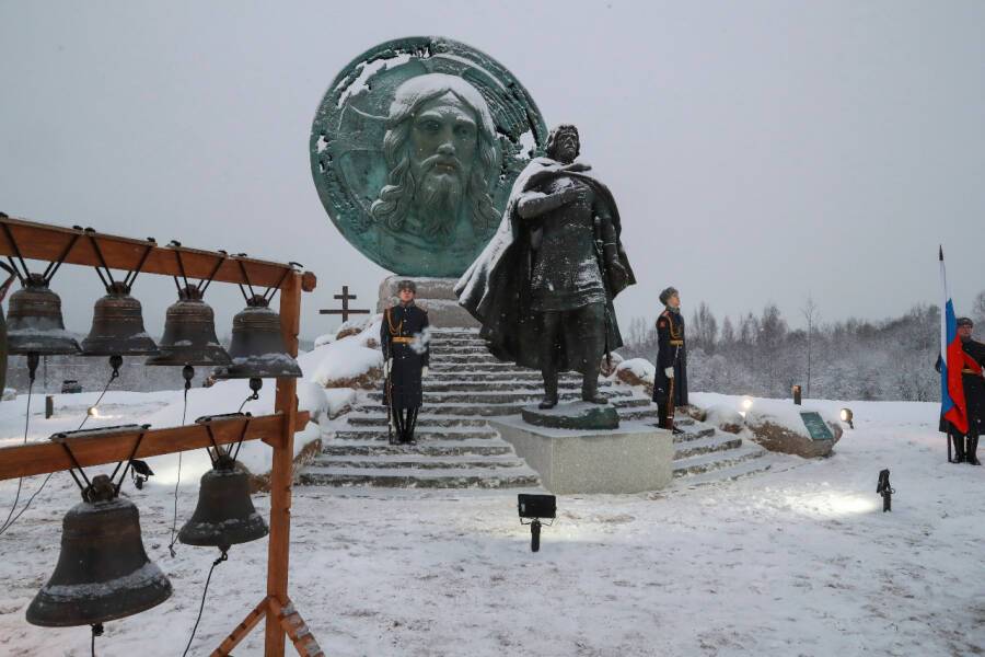 Церемония открытия Мемориального комплекса «Молитва перед боем», посвящённого 800‑летию князя Александра Невского, прошла 22 декабря в городе Никольское Тосненского района Ленинградской области. По мнению многих историков, именно в этом месте князь отдыхал со своей дружиной в 1240 году накануне Невской битвы. Бронзовая композиция, выполненная скульптором Салаватом Щербаковым, состоит из фигуры князя, за ним на каменном постаменте изображён скульптурный лик Христа Спасителя с иконы Спаса Нерукотворного. Памятник создан по инициативе Российского военно-исторического общества и установлен в центре парка, выполненного в форме православного креста.