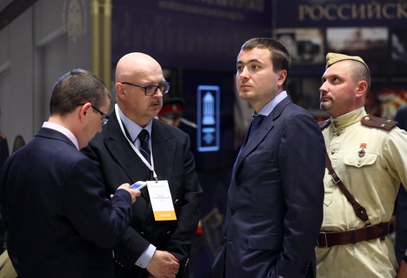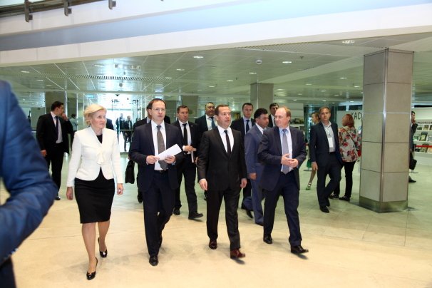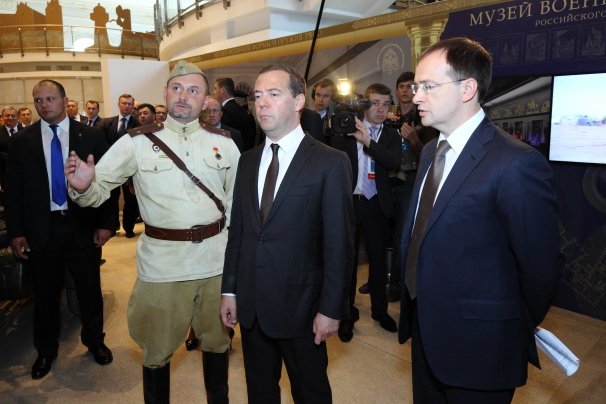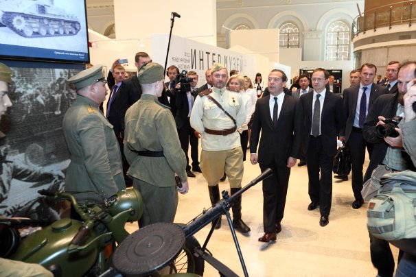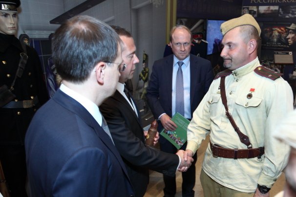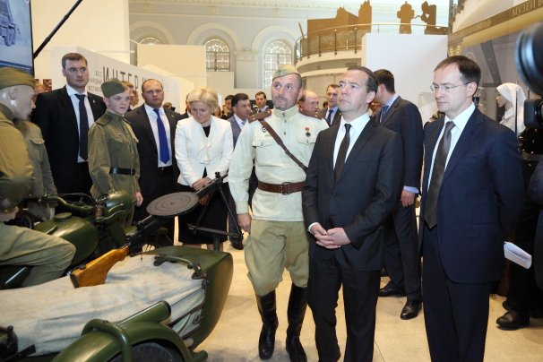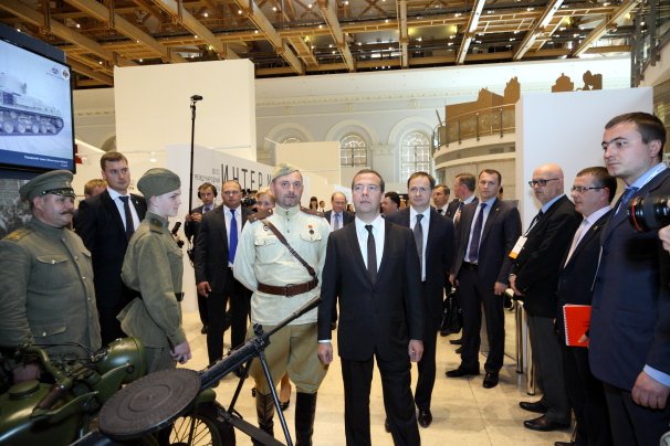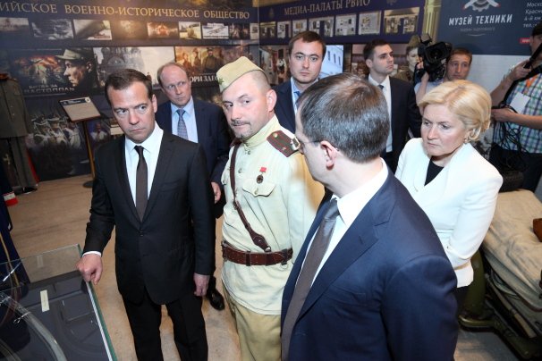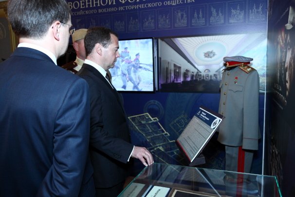 Дмитрий Медведев осмотрел экспозицию Российского военно-исторического общества, представляющего на фестивале "Интермузей-2015" свои уже реализованные и будущие проекты - Медиа-палаты РВИО и будущий Музей военной формы и оружия в Москве, музей "Калининский фронт. Август 1943" в Тверской области.