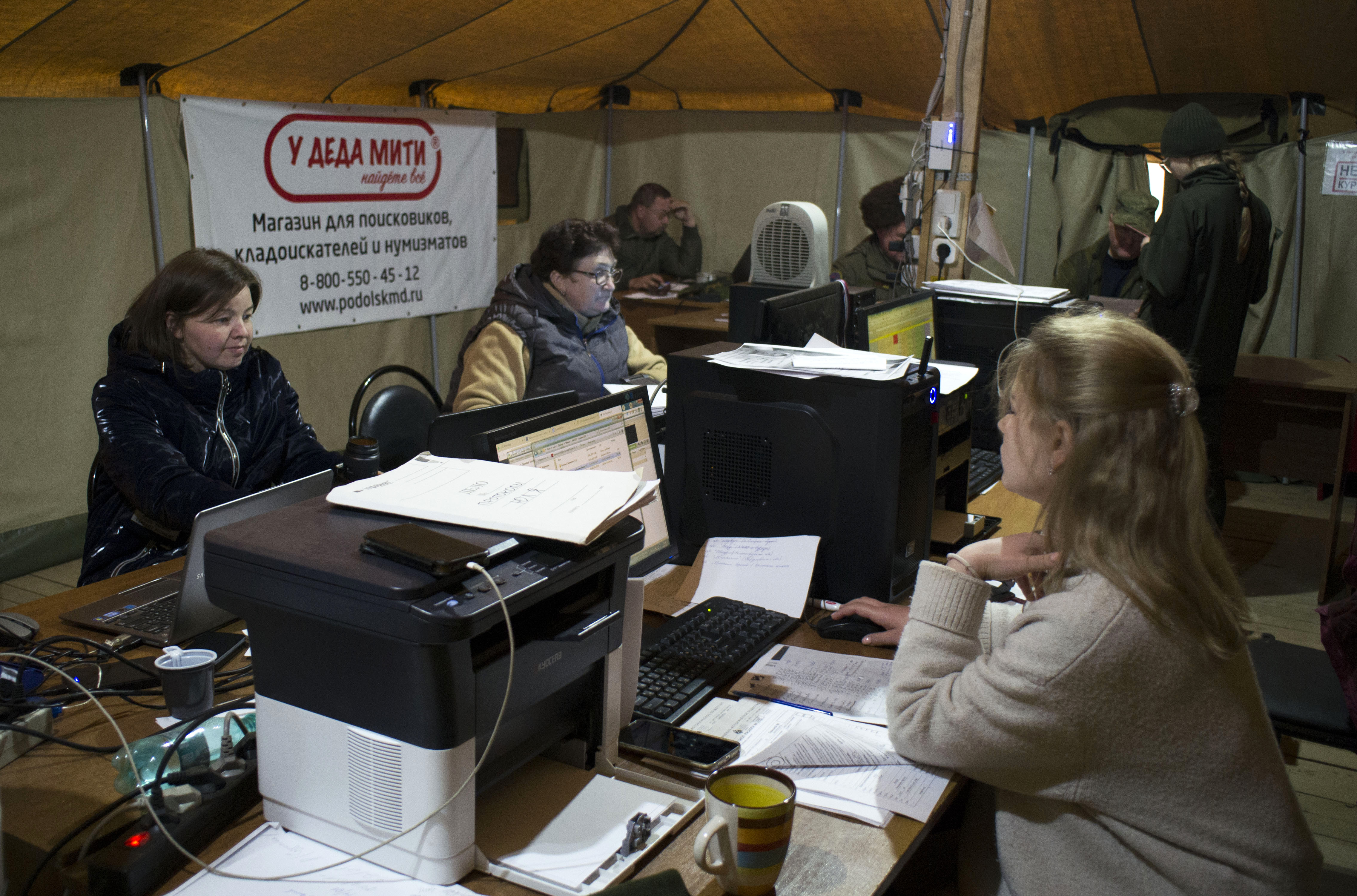 Члены штаба экспедиции также трудятся с раннего утра и до позднего вечера. Они ведут учет поднятых останков, фиксируют данные из прочитанных медальонов, регистрируют прибывающих и уезжающих поисковиков, решают насущные бытовые вопросы и готовят торжественную церемонию закрытия Вахты Памяти, которая состоится у подножия Ржевского мемориала Советскому солдату 29 апреля.