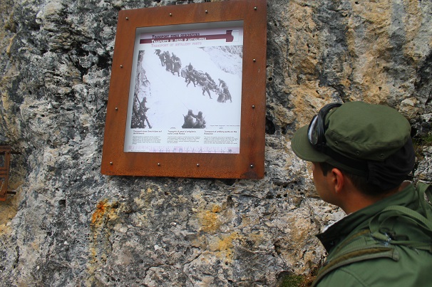 По горным тропам, зимой 1915 года, одни поднимали на высоту три с лишним тысячи метров снаряды, боеприпасы, орудия для огневых точек и площадок австрийской армии, которая здесь - в высокогорьях Доломитовых Альп вела боевые действия со странами Антанты, прежде всего, с соседней Италией. Это был Итальянский фронт Первой мировой войны. Войны, которая для русских пленных солдат и офицеров продолжилась на огромной высоте в 3900 метров, где разряжен воздух и даже просто находиться тяжело. Они мостили дороги, строили огневые фронтовые и тыловые укрепления, вгрызаясь с ледяные скалы, рыли окопы и горные тоннели. А, когда на один из австрийских бараков сошла лавина – приняли участие в спасательных работах, о чем свидетельствует подробная памятная доска в горах.