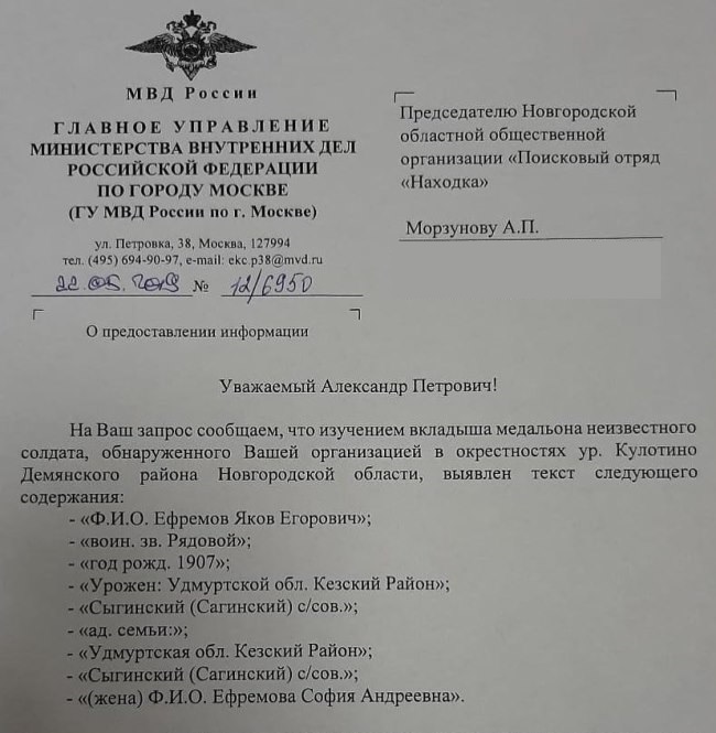Уроженец Кезского района Удмуртии Яков Егорович Ефремов был найден на взгорке у деревни Кулотино Марёвского района Новгородской области. В этом месте минометным огнем «накрыло» группу военнослужащих во время наступления советских войск в мае 1942 года. Их останки оставались непогребёнными на вершине холма 77 лет.