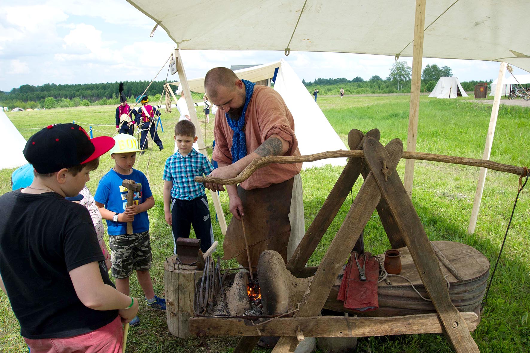 В лагере можно было ознакомиться с жизнью настоящего военного лагеря «русских» и «французов», осмотреть артиллерийское депо, походную кузницу, маркитантскую лавку. Все детали быта в них восстановлены с максимальной исторической достоверностью.