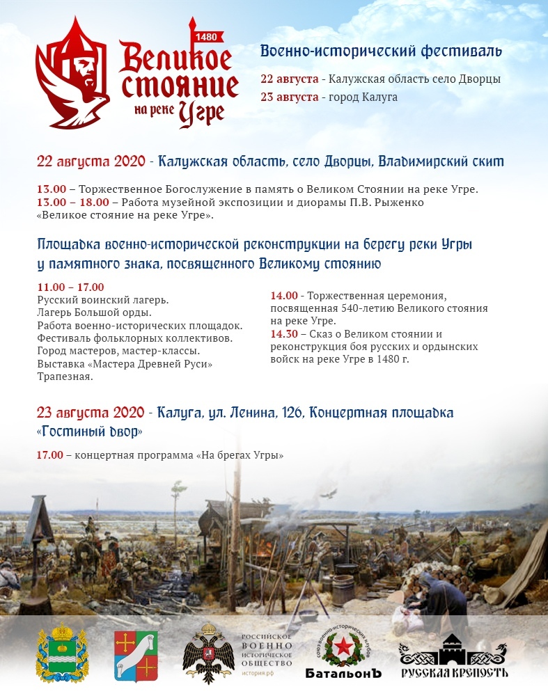22 – 23 августа 2020 года в Калужской области состоится ежегодный Фестиваль «Великое стояние на реке Угре», посвященный 540-й годовщине исторических событий произошедших на реке Угре в 1480 году.