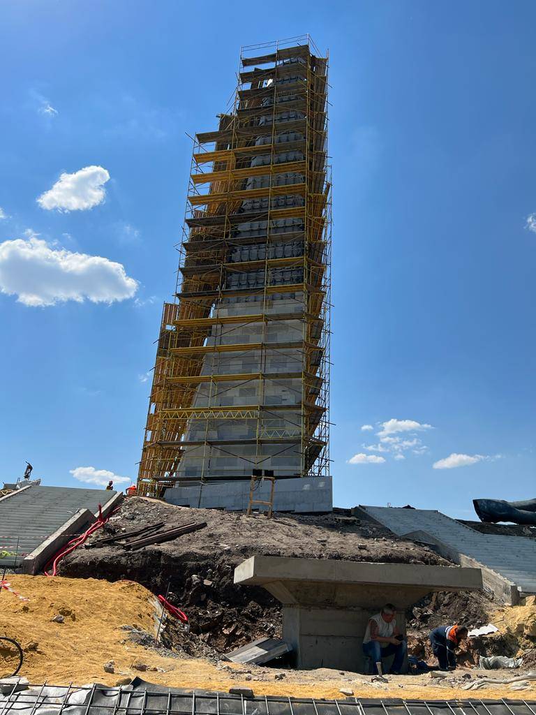 Фигура солдата была доставлена к мемориальному комплексу в разобранном виде. Устанавливать ее будут по частям. Наибольшая сложность заключается в сопряжении скульптурной композиции и облицованной гранитом 36-метровой стелы.