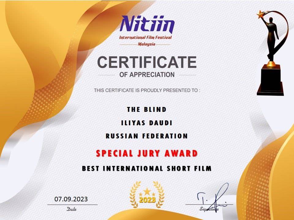 Короткометражный художественный фильм «Слепой» российского режиссёра-постановщика и автора сценария Ильяса Дауди продолжает получать признание зарубежных экспертов. Лента отмечена особыми наградами на кинофестивалях в Румынии, Малайзии, Индии.