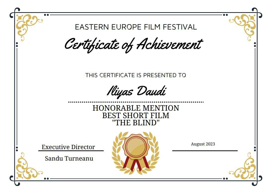 В начале сентября на международном кинофестивале «Eastern Europe Film Festival» (2023) в Румынии — в номинации «Лучший короткометражный фильм» — фильм «Слепой» был отмечен Жюри, как «Honorable Mention»/ «Почётное упоминание».
